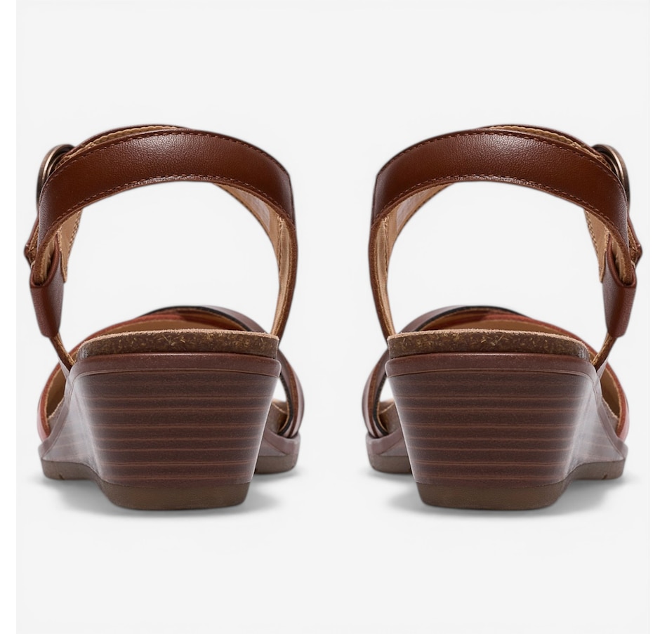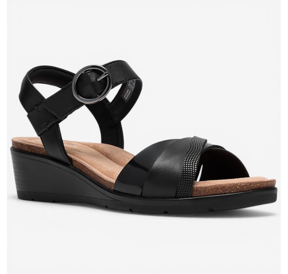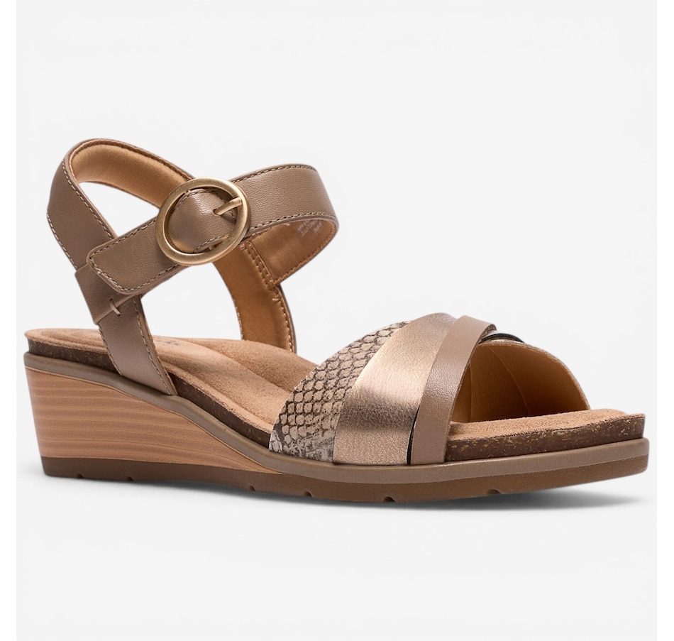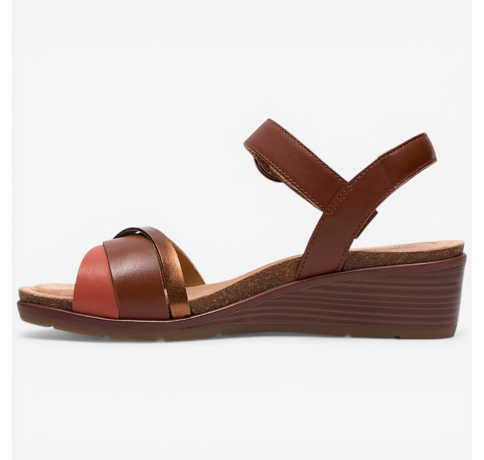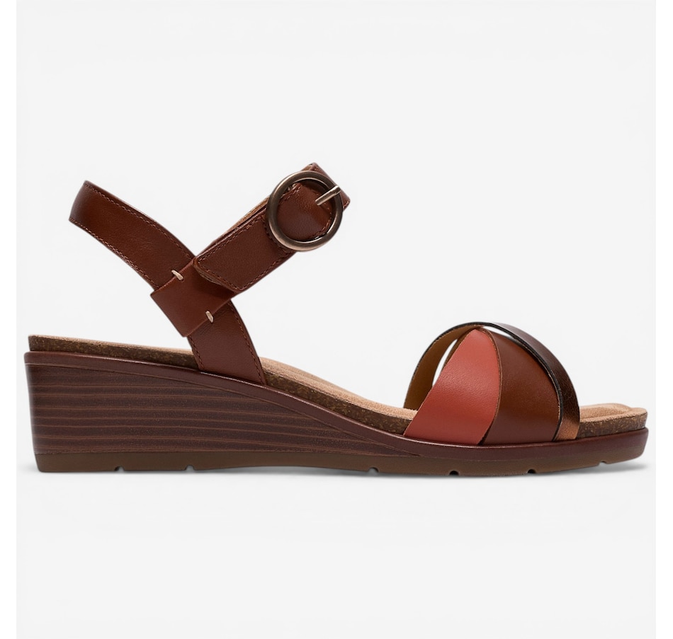 The Kacha Twist wedge sandal from Clarks effortlessly balances modern style with heritage appeal, making it a versatile essential for everyday wear. Crafted from soft, premium leather, this low‑wedge design delivers effortless elevation while remaining comfortable and walkable all day long. A cushioned polyurethane foam footbed and smooth jersey lining provide lasting support and a soft feel against the foot, while adjustable hook‑and‑loop straps ensure a secure, customized fit. Contrast decorative straps and stitching add visual interest, and the water‑dipped stacked wedge paired with a flexible, grippy TPR outsole offers stability and ease with every step.