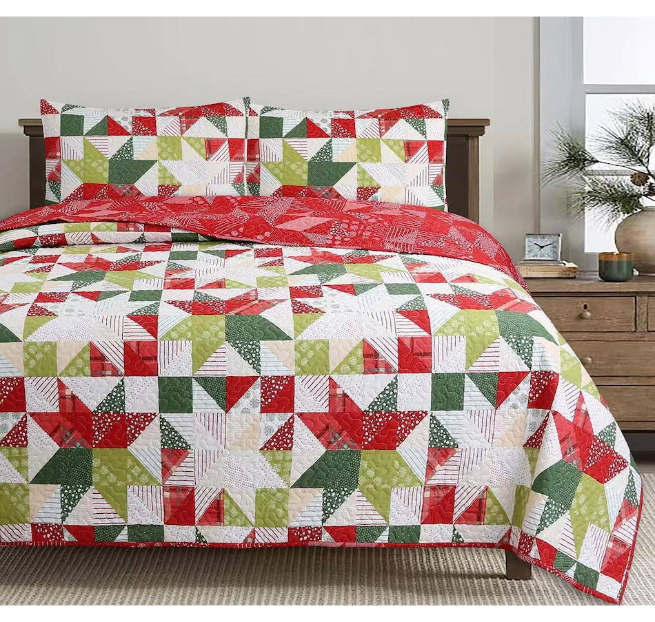 This Christmas quilt set features a stunning holiday design of of modern patchwork with a vibrant holiday colour palette that instantly adds a touch of seasonal cheer to any bedroom. It includes an embroidered quilt and two matching pillow shams that complete the festive look and effortlessly coordinate with your existing holiday décor, plus it brings warmth and style to your bedroom while celebrating the joyous spirit of the Christmas season.