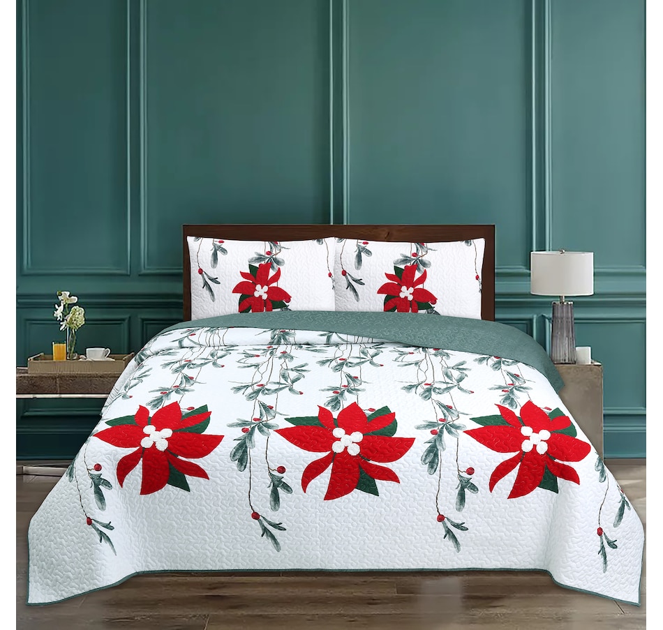 This Christmas quilt set features a stunning holiday design of mistletoe and embroidered poinsettias that instantly adds a touch of seasonal cheer to any bedroom. It includes an embroidered quilt and two matching pillow shams that complete the festive look and effortlessly coordinate with your existing holiday décor, plus it brings warmth and style to your bedroom while celebrating the joyous spirit of the Christmas season.