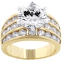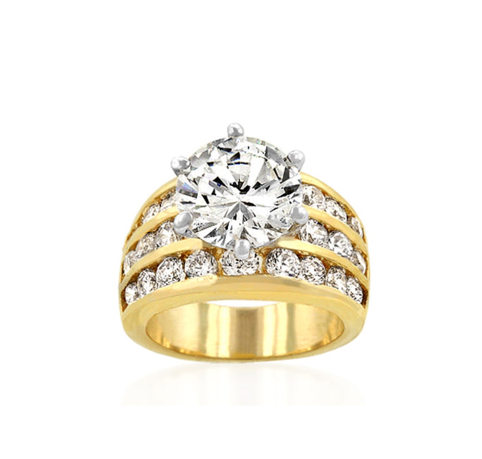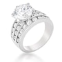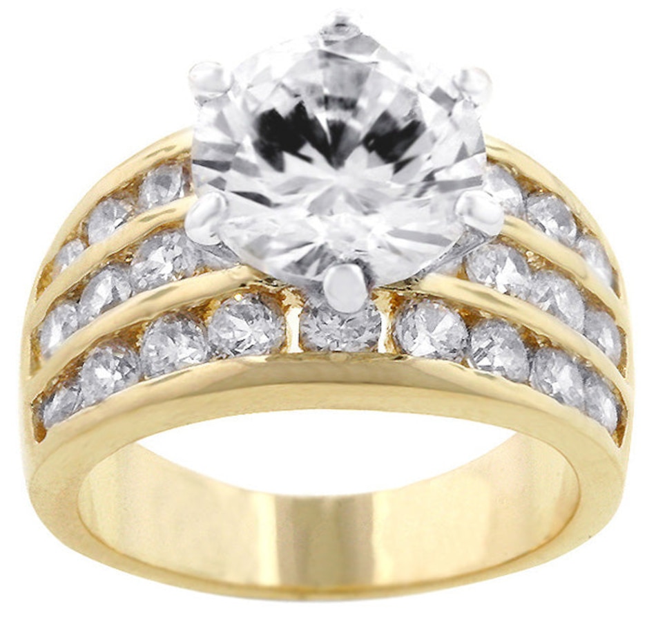 This ring is an absolute classic! The center stone is a whopping 5 carat simulated size set on prongs. The side shoulders boast another 2.5 carats worth of stones to make a 7.5 total carat weight cubic zirconia ring. Our genuine finish is achieved using an electroplating process that coats the item with heavy layers of a close cousin to platinum which gives our jewelry a platinum luster.