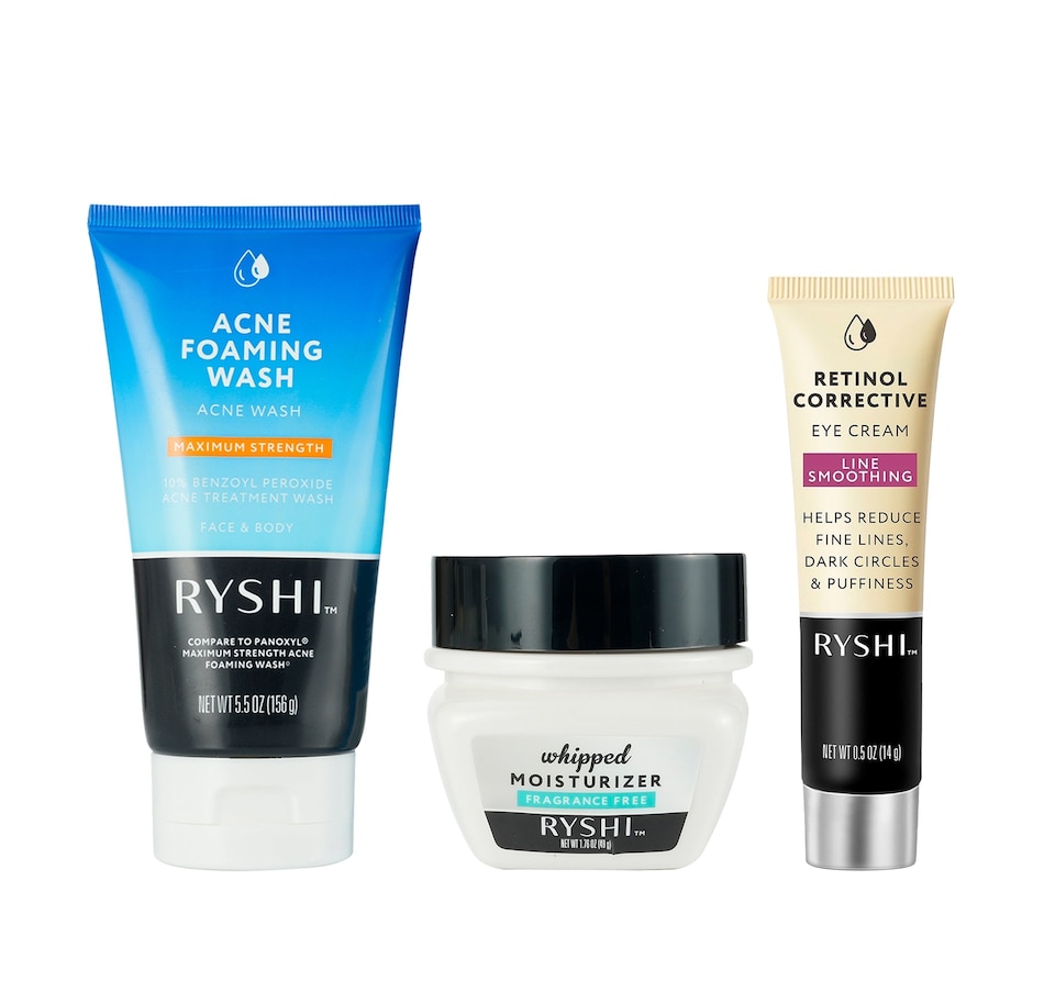 Transform your skincare routine with this targeted three-step bundle designed to fight breakouts, deeply hydrate, and refresh tired eyes. Featuring the Acne Foaming Wash for maximum-strength cleansing, the Whipped Moisturizer for lightweight nourishment, and the Retinol Corrective Eye Cream for youthful, brighter-looking eyes, this trio works together to give you smoother, clearer, and more radiant skin every day.What’s Inside:Acne Foaming Wash (10% Benzoyl Peroxide, 5 oz) – A maximum-strength foaming cleanser that targets breakouts on the face and body. Eliminates acne-causing bacteria, unclogs pores, and helps prevent new breakouts without added fragrance.Whipped Moisturizer (1.7 oz) – A clean, air-whipped cream that provides effective hydration without heaviness. Fragrance-free, hypoallergenic, and safe for sensitive skin—ideal for restoring balance after acne treatments.Retinol Corrective Eye Cream (0.5 oz) – A lightweight, targeted formula that smooths fine lines, reduces puffiness, and brightens dark circles. Powered by retinol, it delivers age-defying results while being gentle enough for daily use.Why You’ll Love This Trio:Clears breakouts with dermatologist-recommended benzoyl peroxideLightweight hydration that won’t clog pores or feel greasyRetinol-powered eye care to smooth and brighten delicate skinFragrance-free, hypoallergenic formulas safe for sensitive skinComplete daily routine for clear, nourished, and refreshed skinHow to Use Together:Start with Acne Foaming Wash morning and night to cleanse face (and body if needed).Gently apply Retinol Corrective Eye Cream around the eyes using your ring finger.Finish with Whipped Moisturizer on face and neck for balanced hydration.In the AM, follow with sunscreen for added protection.Clear breakouts. Hydrate with care. Brighten tired eyes. With the Clear & Renew Skincare Trio, your daily routine just got a powerful, skin-loving upgrade.