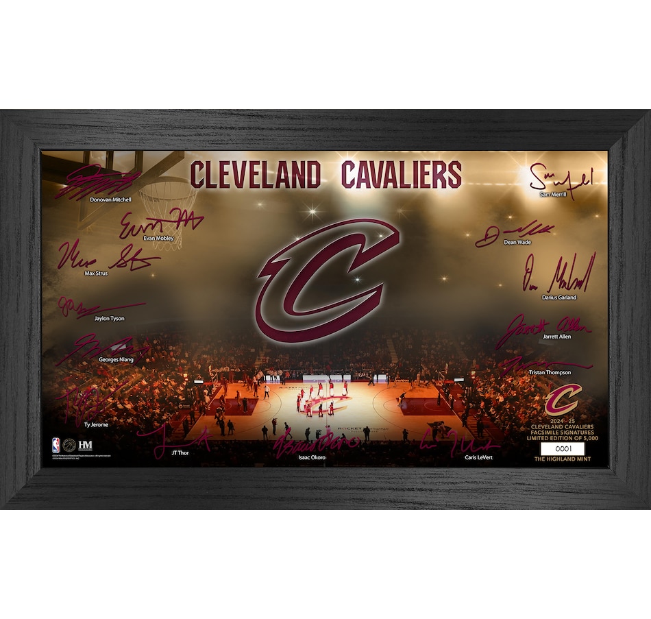 This Signature Court print features facsimile signatures of the Cleveland Cavaliers roster displayed around their home court. Each print is hand-numbered and comes in a 12" x 20" wooden frame with an acrylic glass front panel.