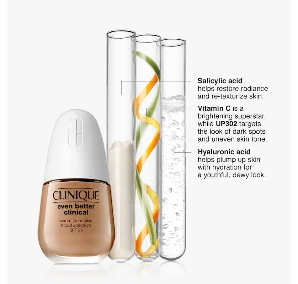 This weightless, medium-to-full foundation with 24-hour wear helps visibly improve skin instantly and over time, and is clinically proven to help leave bare skin looking even better, smoother, more even, and plump. It's also packed with good-for-skin ingredients, including Clinique’s exclusive dark spot-fighting molecule UP302, vitamin C, salicylic acid and hyaluronic acid, while SPF 25 physical sunscreen helps protect skin from future discoloration.
