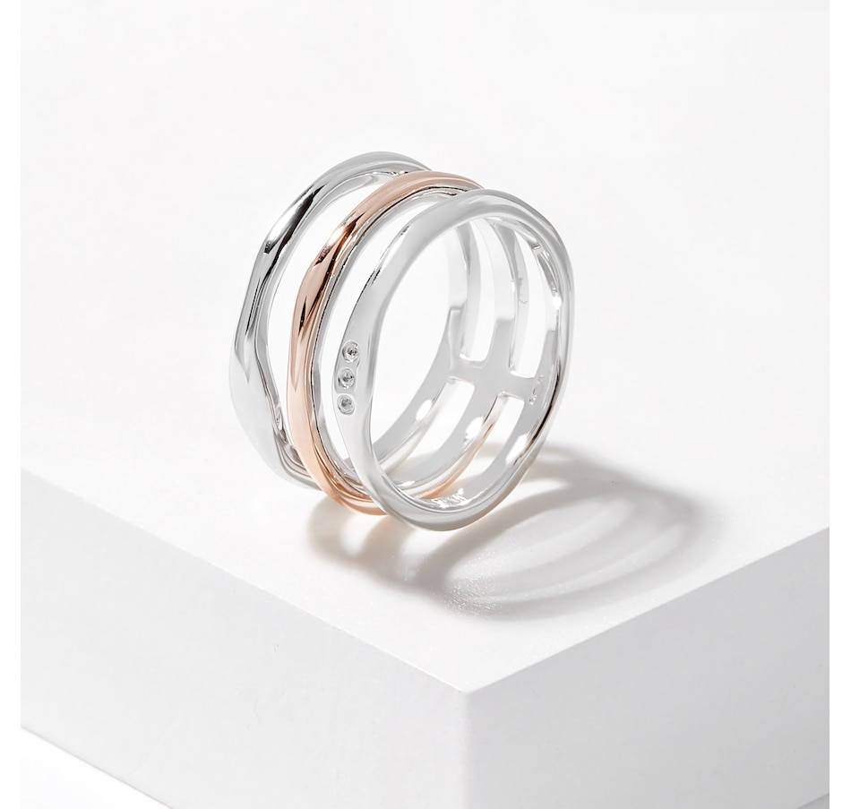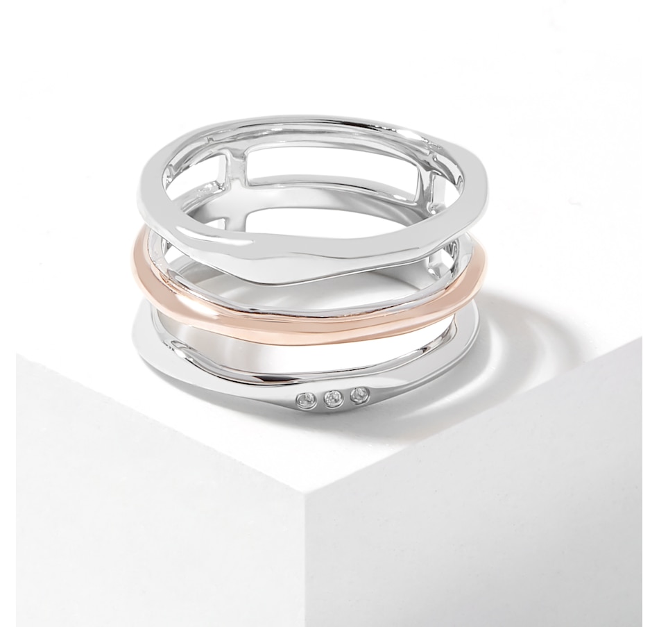 10K Gold & Sterling Silver Ripples Triple White Topaz Band Ring