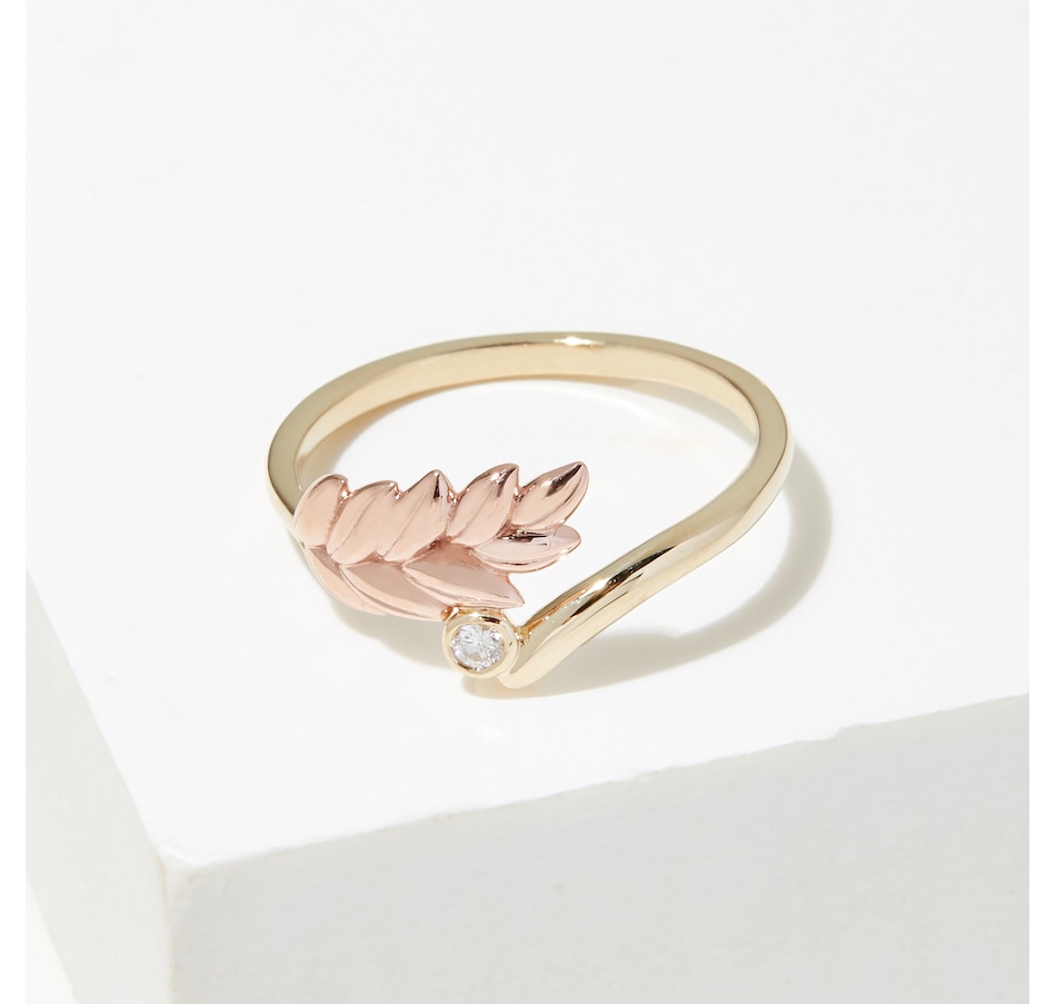 This is a stunning piece to help celebrate the Queen's coronation. Celebrating that hopeful sentiment, this Lilibet ring is crafted from two-tone gold and features a slender stalk crowned with an ear of wheat nesting against a single sparkling diamond. This is a wonderful tribute to a beloved monarch from Clogau Gold.