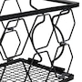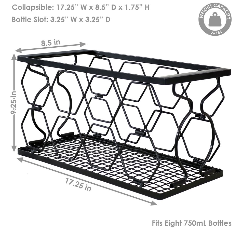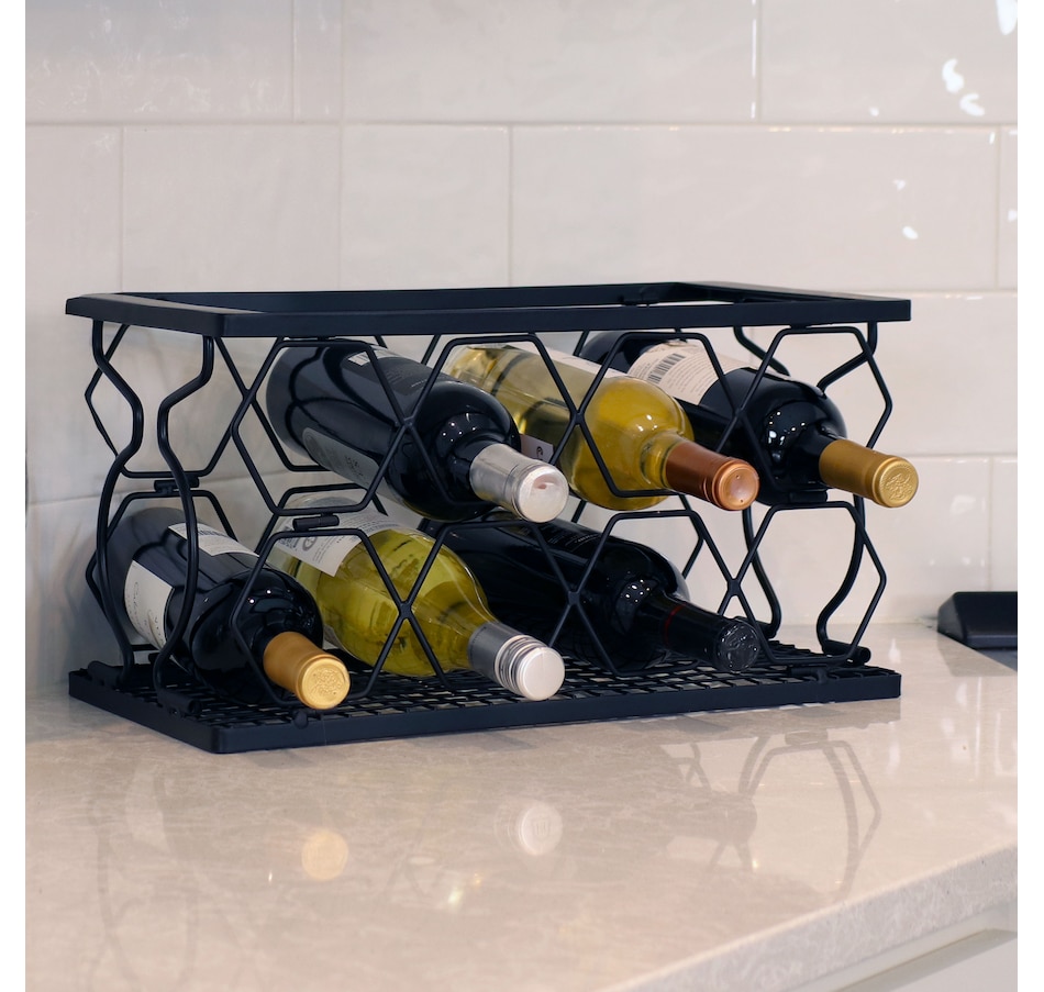 Organize and display up to 8 bottles of wine with this small wine bottle rack. The metal wine rack features 8 hexagon-shaped slots designed to fit 750 ml bottles, offering space for storing white wine and red wine of all kinds. The wine bottle organizer can be placed on a tabletop, on a kitchen countertop, in a pantry, or in a wine cellar to keep bottles of wine conveniently located. Made from durable iron, this tabletop wine rack features a food-safe, black finish and metal wire design for a modern look. It's easy to store the rack when not in use too. The rack folds down flat for compact storage. Just push in the sides and press downward on the top of the rack to collapse it in seconds.