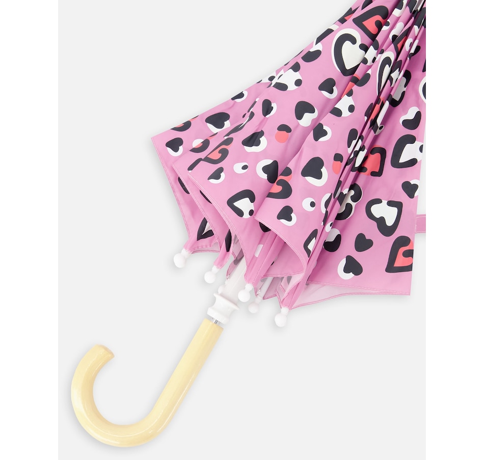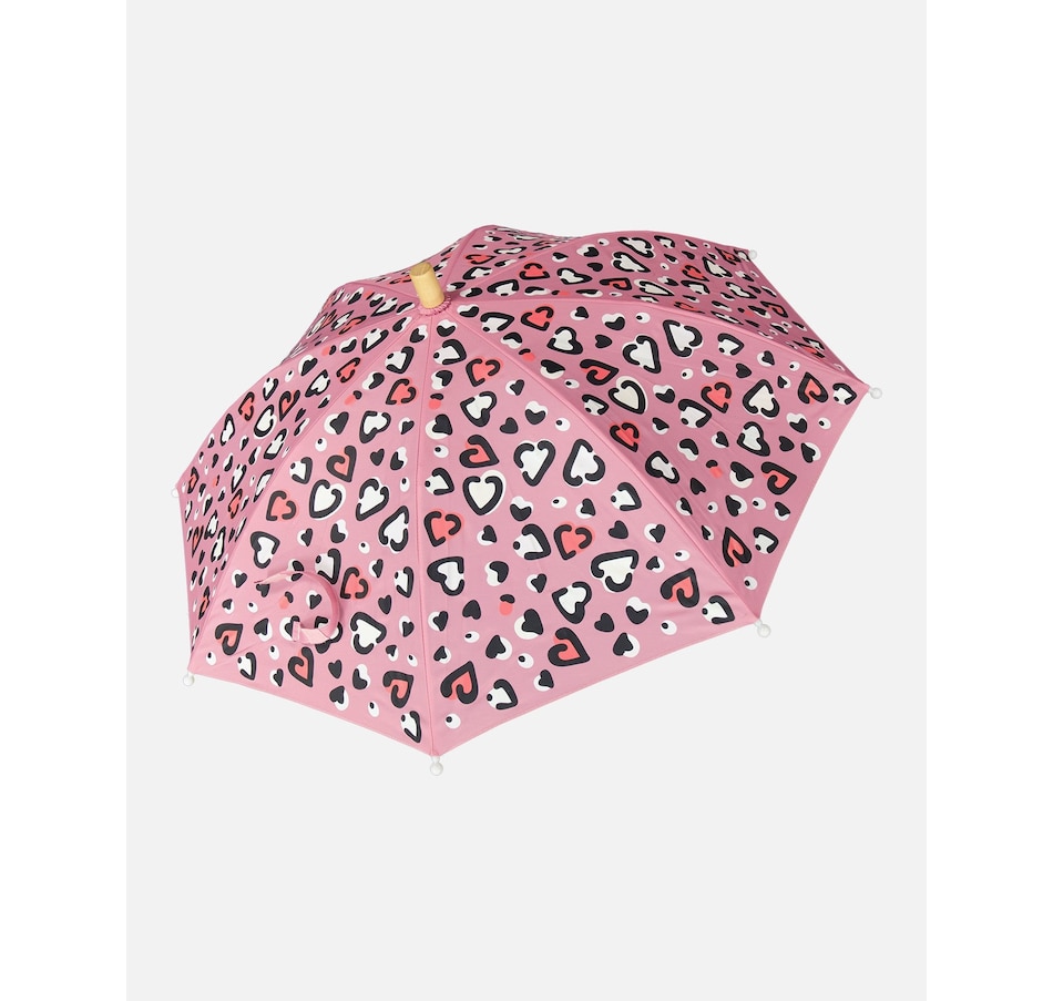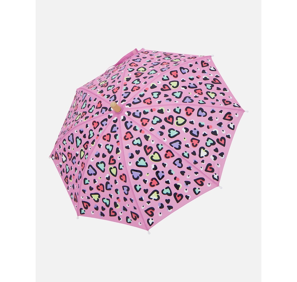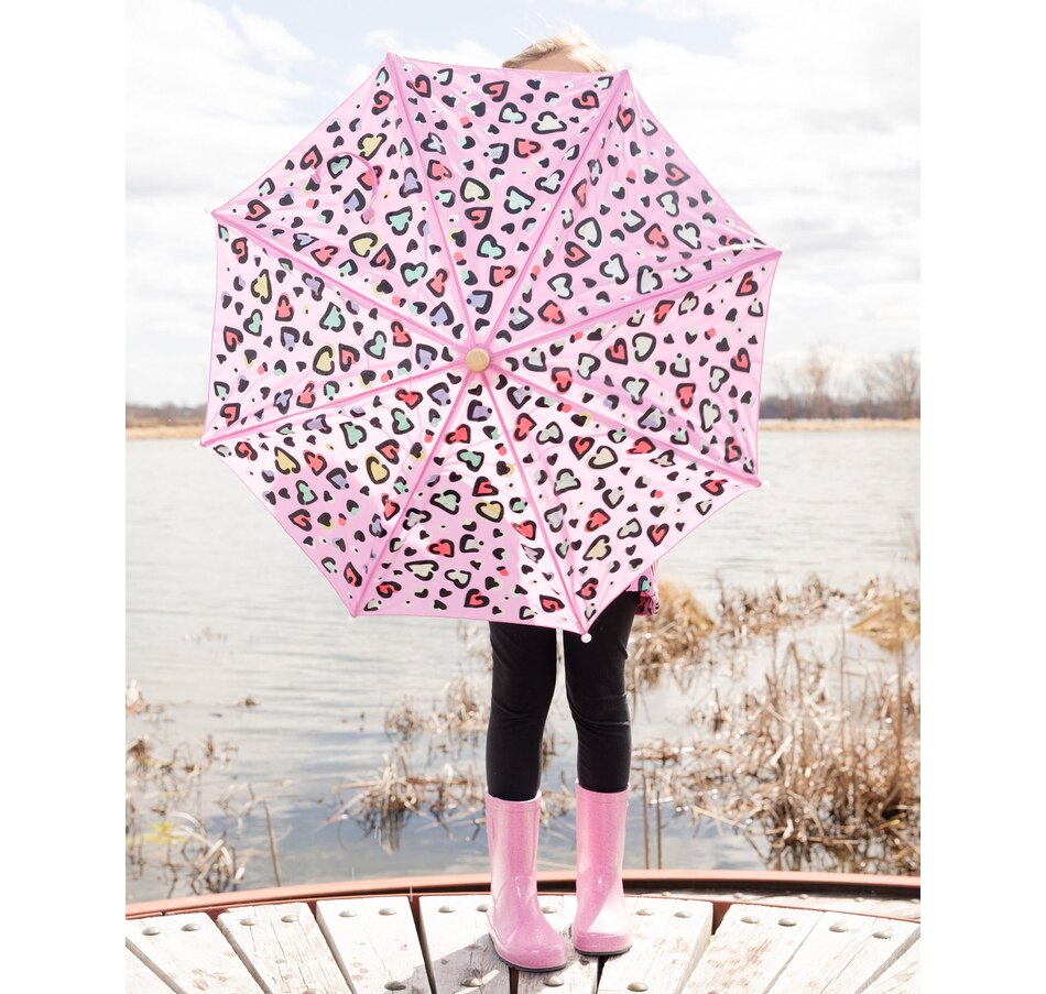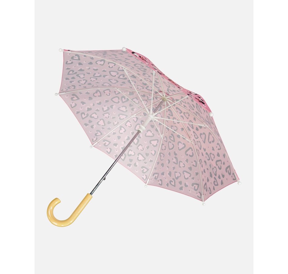 Make rainy days magical with this pink umbrella featuring an allover heart print that changes color when it gets wet! Designed with eight sturdy panels and a smooth curved handle, this classy accessory combines fun innovation with everyday functionality. The lightweight polyester canopy provides reliable rain protection while revealing a playful transformation that kids will love watching again and again.