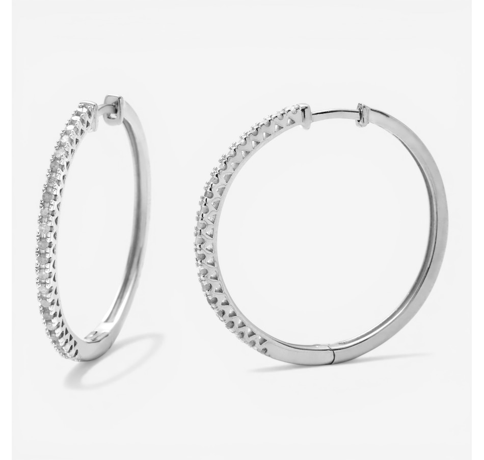 These classic hoop earrings feature a graceful row of white diamonds set in polished sterling silver. The timeless silhouette delivers refined sparkle with everyday versatility. Elegant and easy to wear, they’re a sophisticated addition to any jewellery collection.