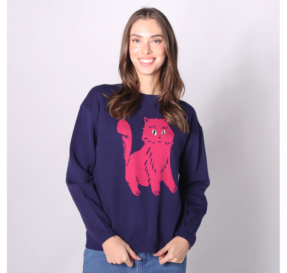 • Relaxed fit, rib crewneck, cuffs and waist, drop shoulder, jacquard cat logo, long sleeves