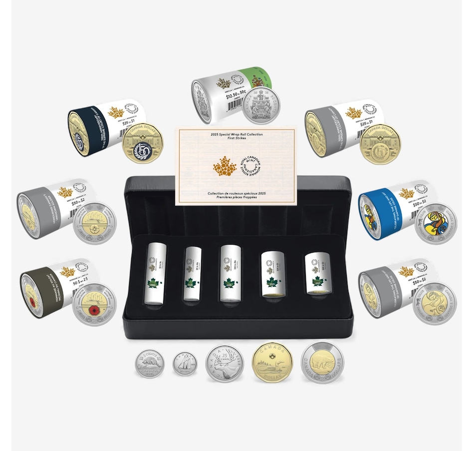 Own the complete 2025 special wrap Royal Canadian Mint roll collection with this comprehensive set. The set includes all regular design first-strikes in the original RCM case, plus the half-dollar denomination and all commemorative issues. All the coins are in brilliant uncirculated condition, still mint sealed in the original special wrap rolls. The set includes a total of 12 different mint rolls: five $2 rolls, three $1 rolls, a half-dollar roll, a 25-cent roll, a 10-cent roll and a five-cent roll.