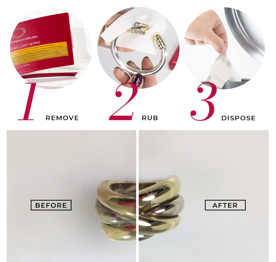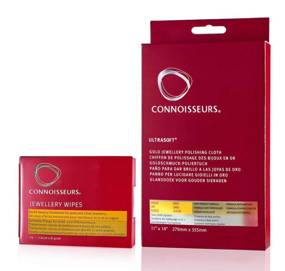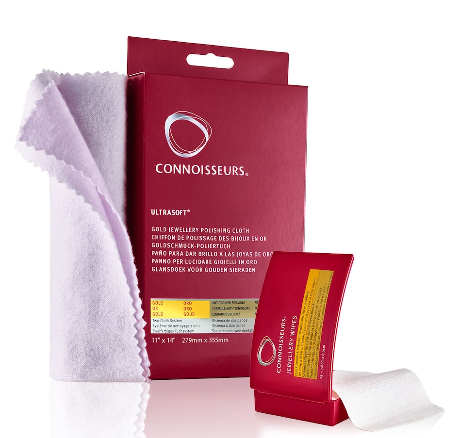 Clean and polish your gold jewellery with this gold-polishing cloth and these wipes from Connoisseurs.