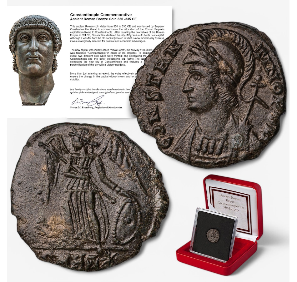 After reuniting the two halves of the Roman Empire in 324 CE, Constantine declared the city of Byzantium to be its new capital. Although it was far from the old capital (located in what is now modern-day Turkey), it was strategically selected for political and economic advantages. More than just marking an event, the coins effectively served as propaganda to ensure the change in the capital widely known and to emphasize continuity and stability.