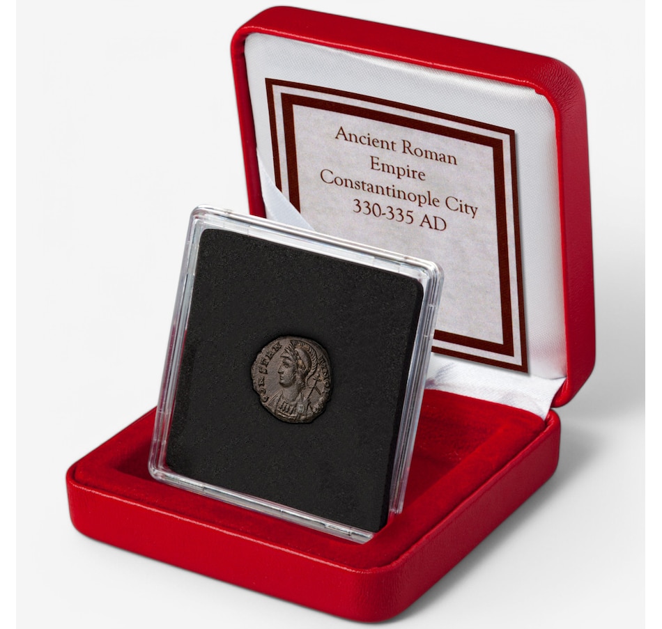 This ancient Roman coin dates from 330 to 335 CE and was issued by Emperor Constantine the Great to commemorate the relocation of the Roman Empire's capital from Rome to Constantinople. Although the coin is close to 1,700 years old, it is in premium high-grade condition with sharp, clear design elements and very little wear.