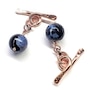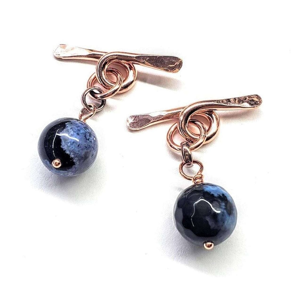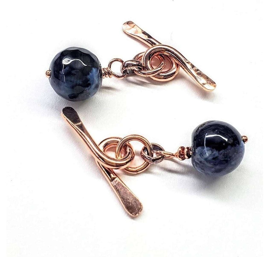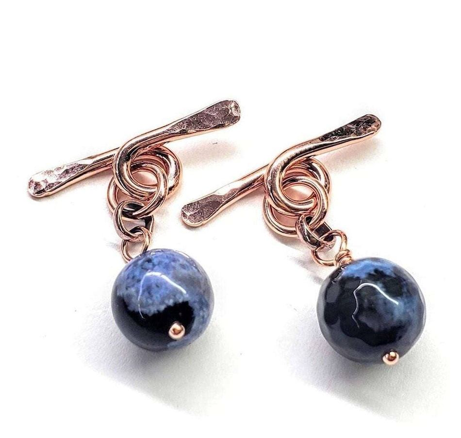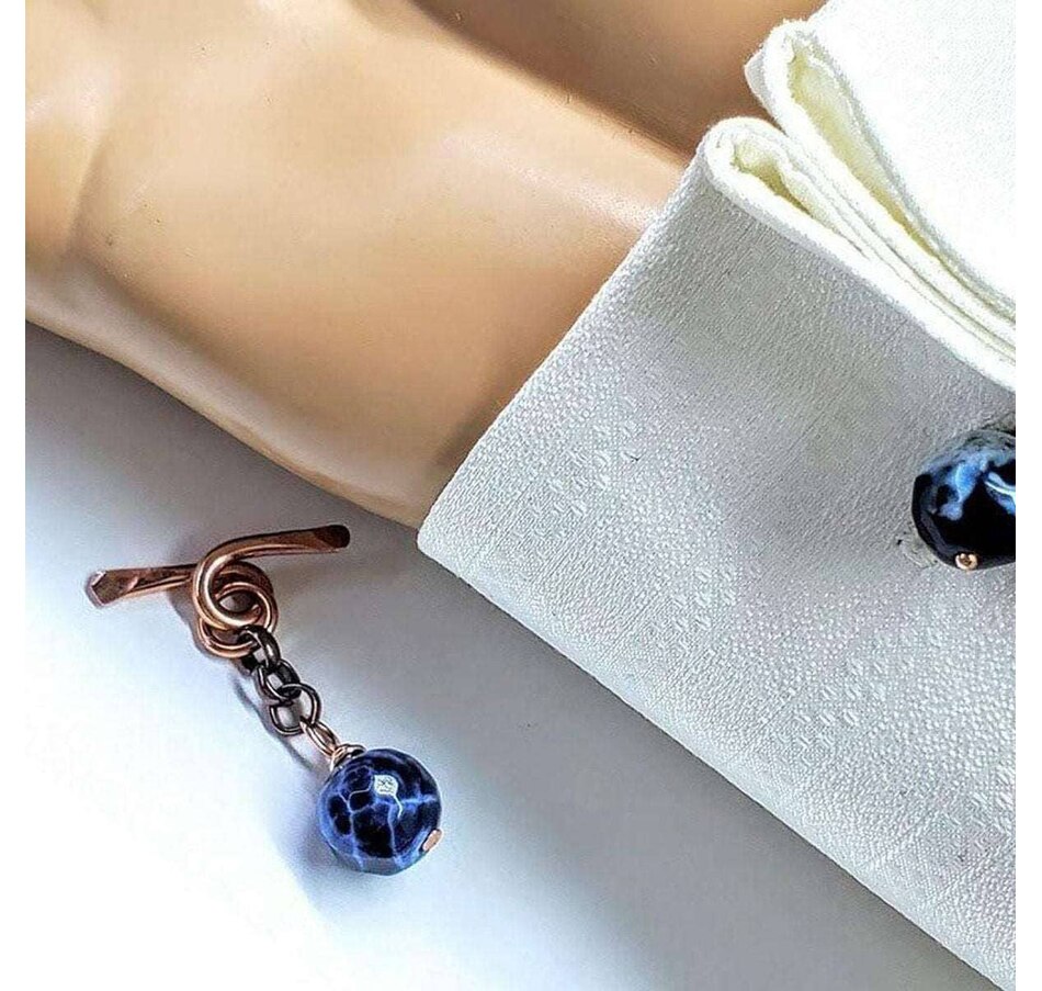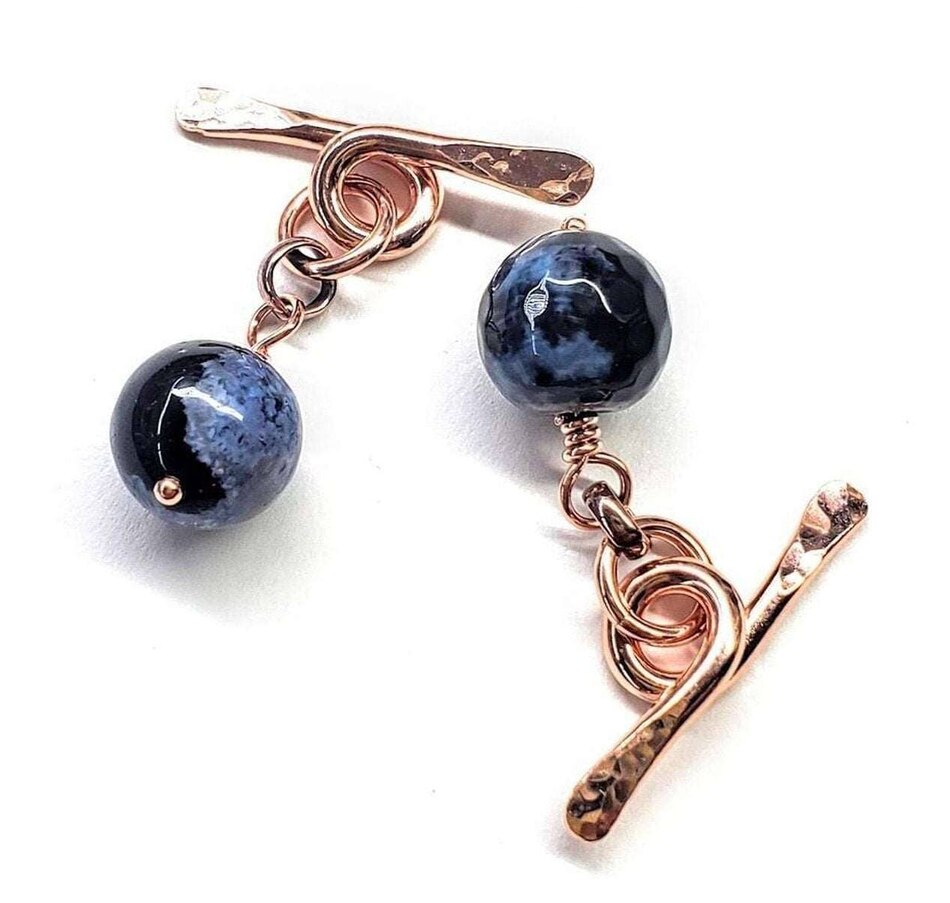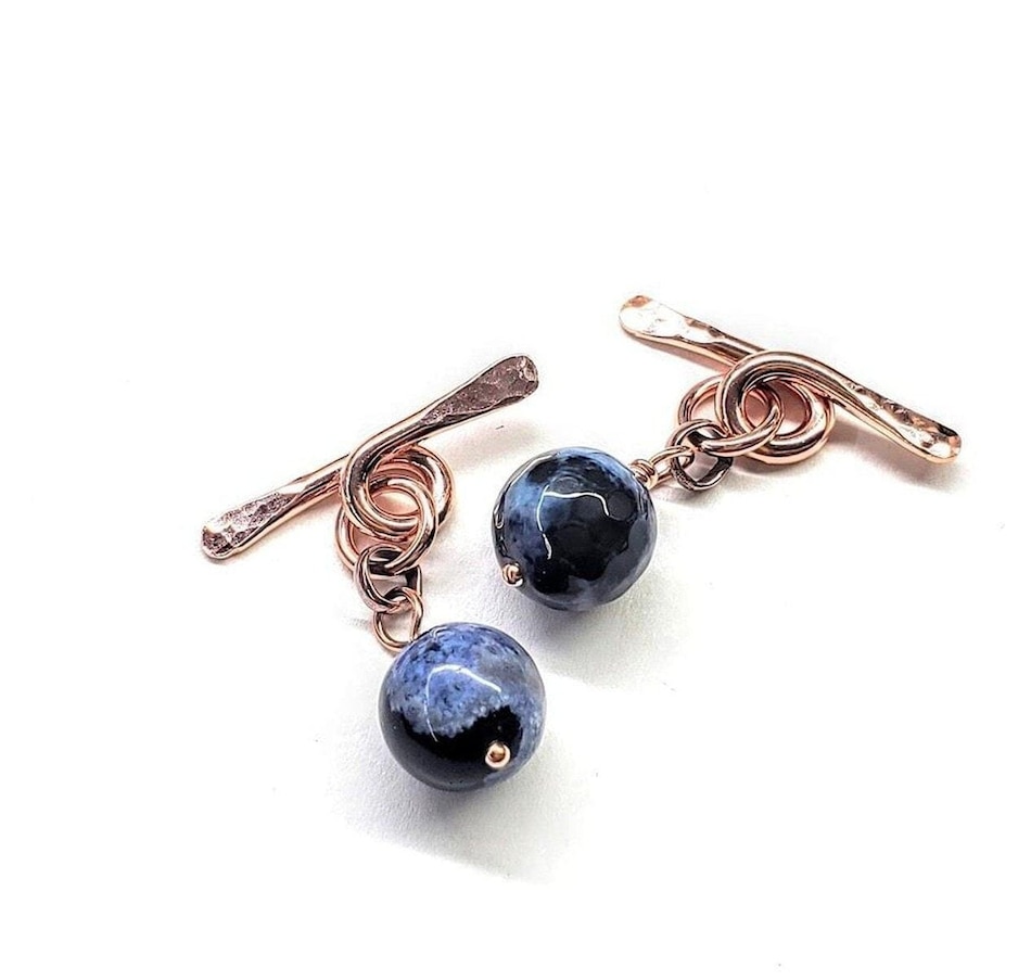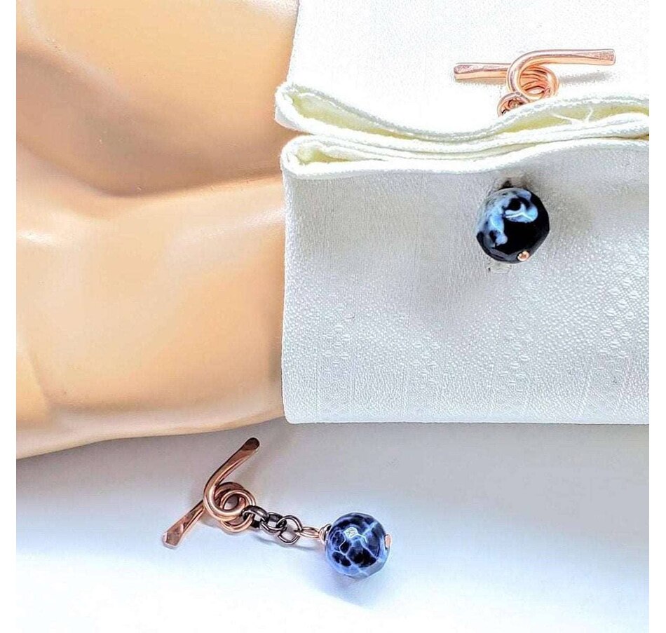 SAVE $5.00 off LOVE-HEALS-HURT - Child Abuse Awareness JewelryUse Checkout Code "CPC5"We donate 20% off each retail order placed with us to the Carl Perkins Center in TN Help raise awareness to prevent Child Abuse with these handcrafted unique copper chain cufflinks which feature each beautiful black blue crackle agate beads of 10mm. When I was designing these I was thinking that the blue and black agate beads symbolizing very well the child and what abuse does to a child, It takes over their life, just like the black in the agate seems to take over the stone beads. The shiny rose gold colored hammered copper loop toggle gives these handmade chain cufflinks a touch of elegance.Unique and ElegantWear them on all your buttonless cuffs10 mm agate beads - each bead is different12 ga 7/8" copper hammered loop toggleLength of Cufflinks 1 inchEach cufflink is a bit different Handmade in MontanaFYIAgate is an excellent stone for rebalancing and harmonizing body, mind, and spirit. It cleanses and stabilizes the aura, eliminating and transforming negativity. Agate enhances mental function, improving concentration, perception, and analytical abilities. It soothes and calms, healing inner anger or tension and creates a sense of security and safety.