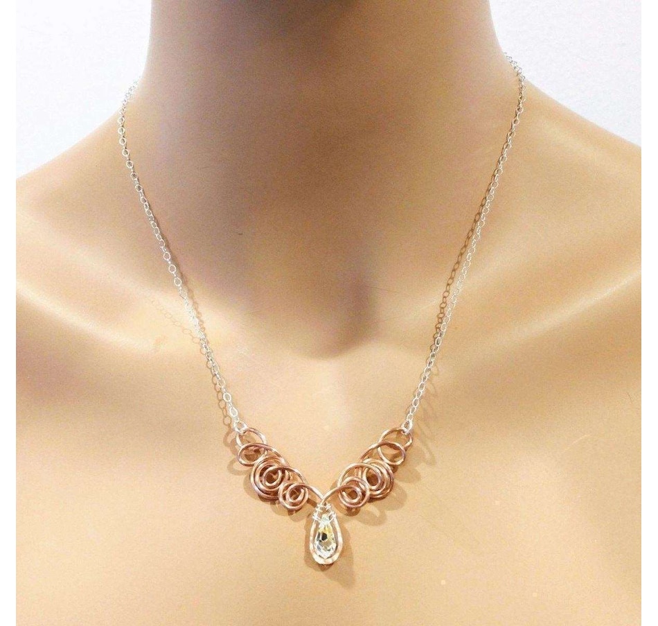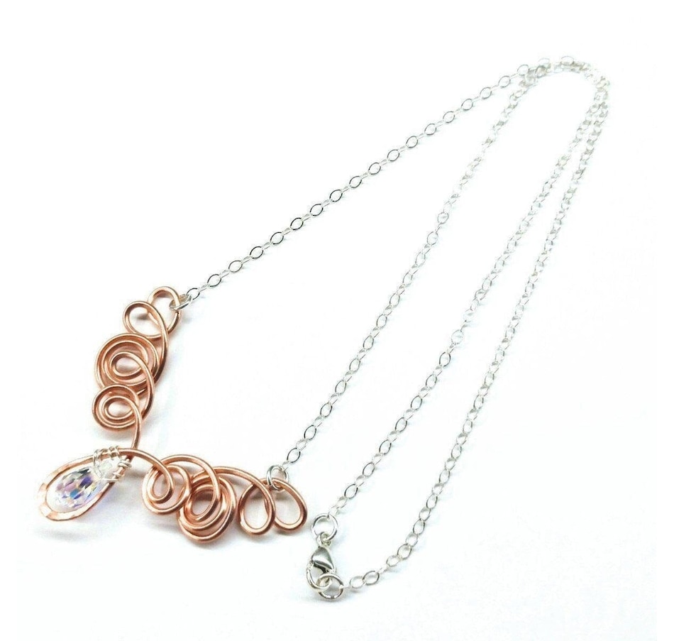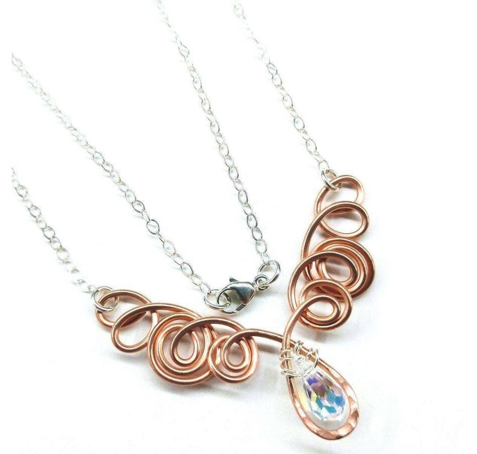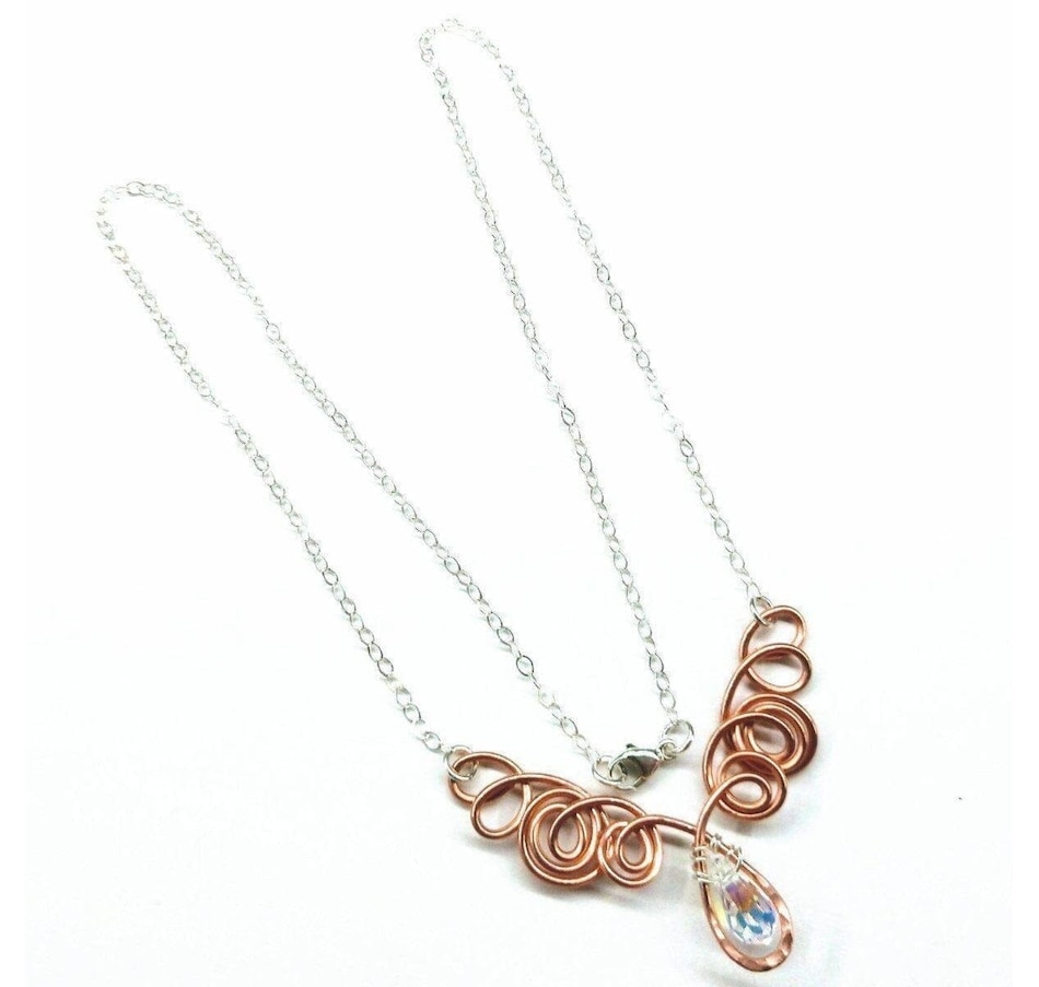 Adorn your neck with the gorgeous Copper Wire Sculpted Angel in Flight Necklace. This sterling silver chained necklace boasts a stunning center piece crafted with only one piece of copper wire, layered sculpted closing loops and a dazzling Swarovski Crystal AB drop. Delicately hammered and finished to perfection, you'll be filled with divine inspiration every time you slip on this stunning piece. Embrace your angelic charm with this truly exquisite necklace! Original Design Unique wire sculpted designSturdy 18 gauge copper wireSterling silver flat cable chainSterling silver lobster clasp closure11x6 mm Swarovski Crystal AB teardrop beadsThe length of the necklace is 18 inchesMade in Montana USA