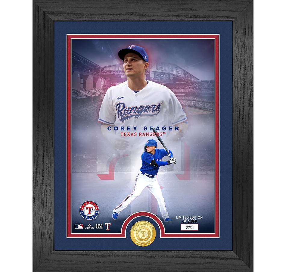 This limited edition 13" x 16" frame features Corey Seager in multiple poses and his facsimile (replica) signature combined with a bronze coin. Double matted under glass in a wood frame is an exclusive, hand numbered 8"x10" photo print and a 39mm minted bronze team coin. As a limited edition of only 5000 and officially licensed by the MLB and MLBPA, each photo mint is accompanied by a certificate of authenticity. This product is proudly made in the U.S.A. by The Highland Mint!