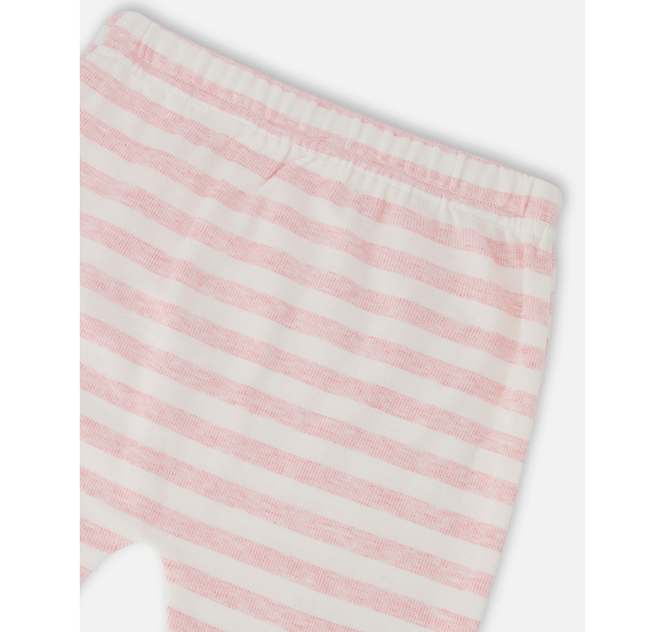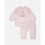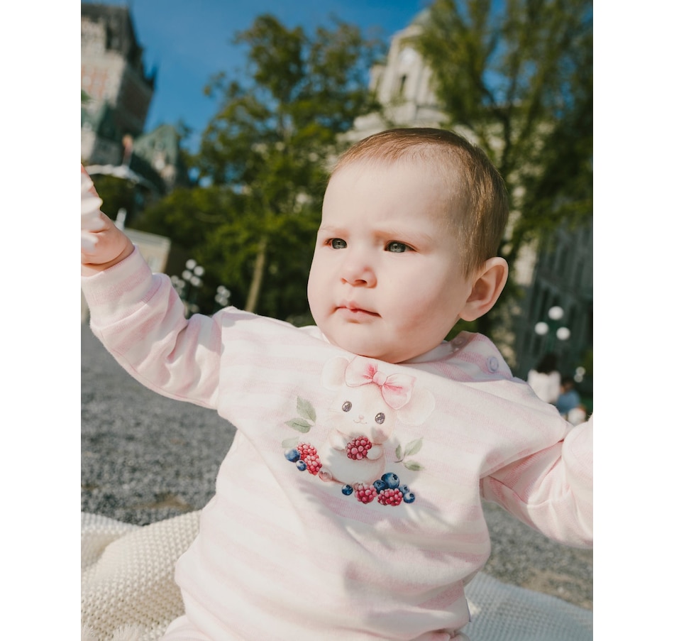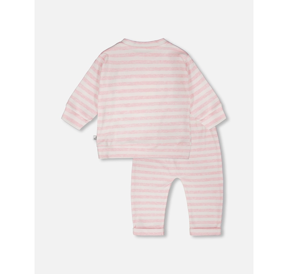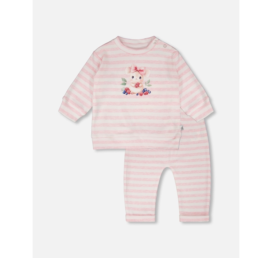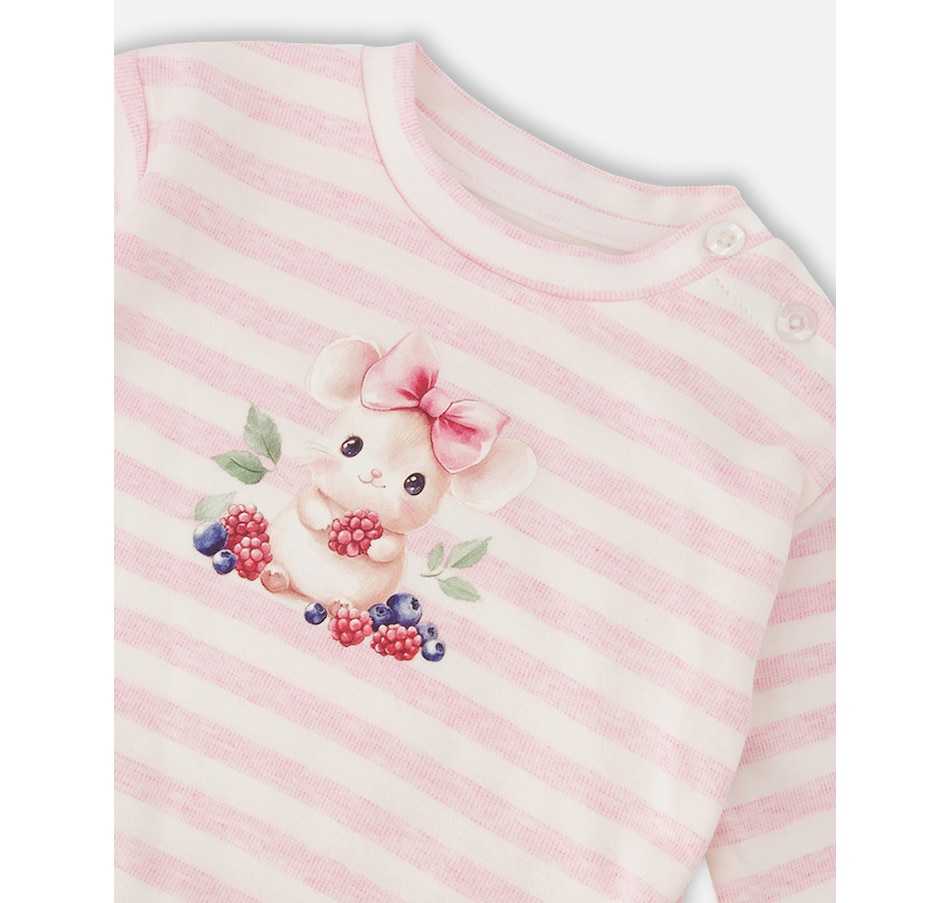 Bright stripes and a cheerful little mouse make the top and pants set white and pink stripes a playful everyday outfit for baby girls. The long-sleeve sweater features shoulder snaps for easy dressing and a sweet mouse motif at the front, while the matching striped pants come with an elastic waist for extra comfort. Made in soft cotton jersey, the fabric is lightweight, breathable, and ideal for both playtime and rest.