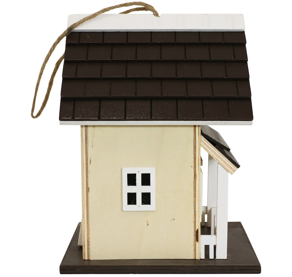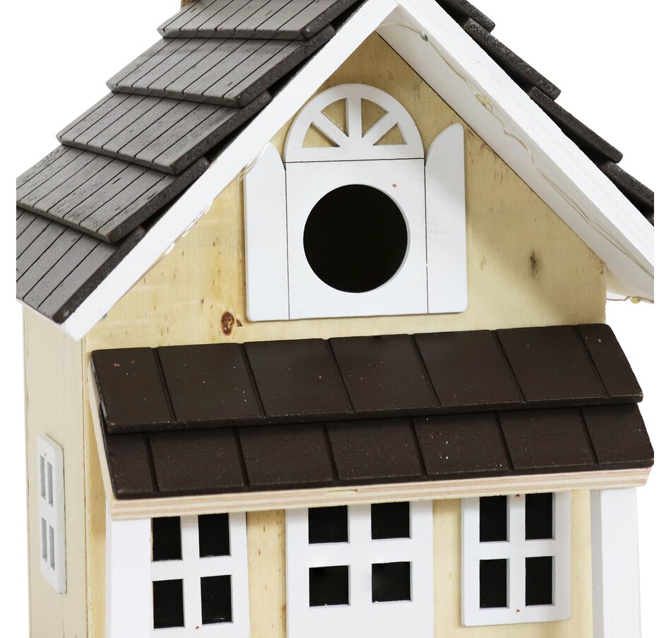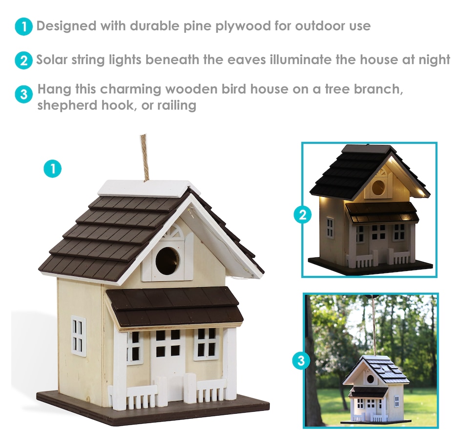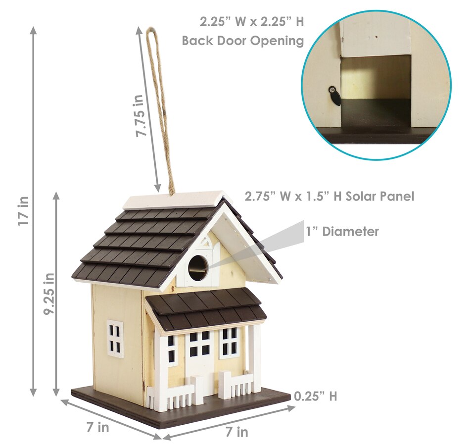 Welcome bluebirds, chickadees, martins, sparrows, and other small birds to the backyard, patio, or campsite in style with this luxurious, cozy hanging wooden bird house. Hang it from a tree branch, shepherd hook, beam, or railing with the attached rope in any outdoor space to watch as birds come to rest. This bird house is made from durable pine plywood and is designed to be used outdoors. The bird house has a 1" long perch and 1" diameter hole so birds can peek inside. There is a string of solar-powered lights at the top of the eaves to illuminate the little house at night. The solar panel that powers the lights requires 8 hours of direct sunlight to fully charge. The lights will illuminate for up to approximately 4 hours on a full charge. The bird house has a 2.25" square door with a latch on the side to easily open it to access and clean the inside of the bird house.