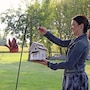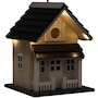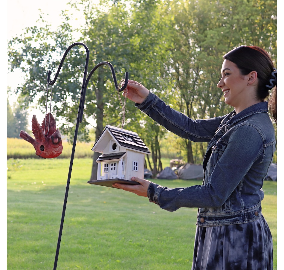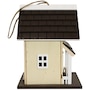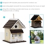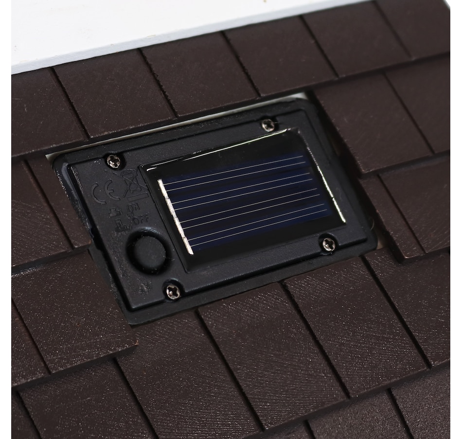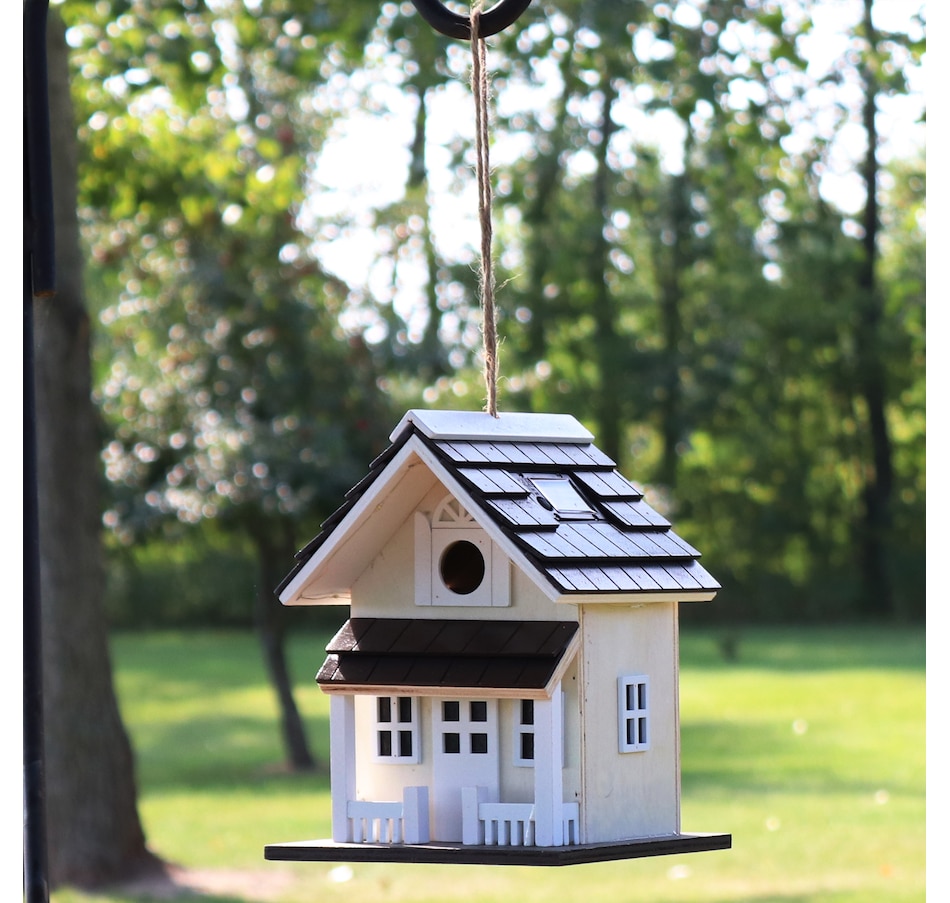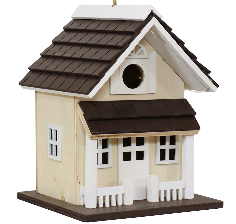 Welcome bluebirds, chickadees, martins, sparrows, and other small birds to the backyard, patio, or campsite in style with this luxurious, cozy hanging wooden bird house. Hang it from a tree branch, shepherd hook, beam, or railing with the attached rope in any outdoor space to watch as birds come to rest. This bird house is made from durable pine plywood and is designed to be used outdoors. The bird house has a 1" long perch and 1" diameter hole so birds can peek inside. There is a string of solar-powered lights at the top of the eaves to illuminate the little house at night. The solar panel that powers the lights requires 8 hours of direct sunlight to fully charge. The lights will illuminate for up to approximately 4 hours on a full charge. The bird house has a 2.25" square door with a latch on the side to easily open it to access and clean the inside of the bird house.
