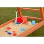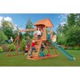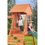 The Cedar Chalet Complete Wooden Playset is designed at a compact size for smaller backyards, but is a fun-filled backyard escape! Measuring 17'8" long by 9' deep, this playset packs in fun features and sturdy support beams, ensuring a small-space, high-quality playset. The chalet-inspired wooden roof offers a shady retreat in the main tower, as well as in the spacious sandbox underneath. All wood is pre-cut, pre-drilled and pre-stained for easy assembly. Featuring two swings and a trapeze bar, as well as a rock-climbing wall, slide, steering wheel and wooden ladder, this playset is all about action! Kids can build arm strength and hang like an acrobat on the trapeze, soar to new heights on the double swings, construct sand castles underneath the tower, scale the rock wall to the four-foot deck, or race down the slide! The Cedar Chalet Wooden Playset includes all wood, hardware, accessories and instructions necessary for assembly.