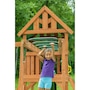 The Mountain View Lodge Complete Wooden playset with Wooden Roof features a multitude of creative play activities. Inspired by a luxurious mountain lodge, this playset offers endless possibilities, radiating from its central tower with a four-foot deck. Little explorers can grab the oversized binoculars to spot distant lands or wildlife, while the captain can steer to safety (or towards an adventure!) with the heavy-duty steering wheel. Kids can scale the rock-climbing wall and wooden ladder duo and then race down the eight-foot slide or make a break for it on the monkey bars! Take a rest in the shade playing in the spacious sandbox underneath the tower, or become a circus performer twirling on the trapeze bar and rings. Swing for hours on the side-by-side swings, or watch the clouds and feel the breeze—childhood at its finest! This fun-packed playset includes all the wood, hardware, accessories and instructions necessary for assembly.
