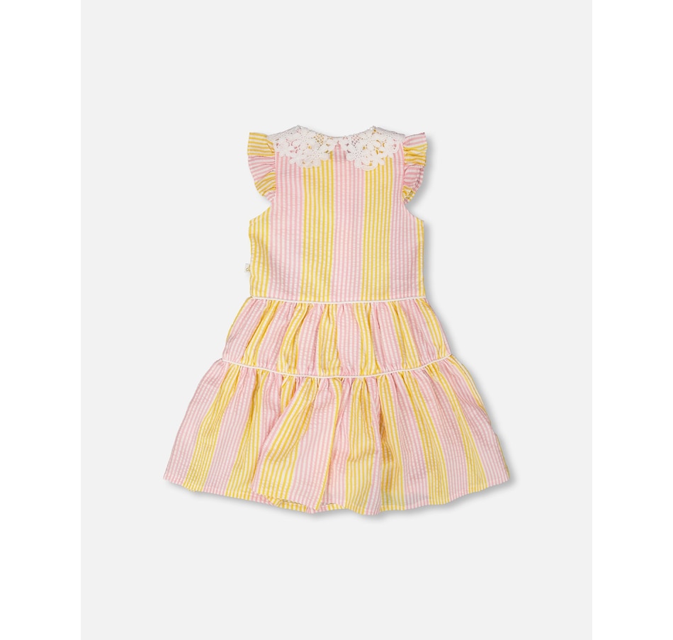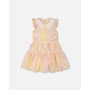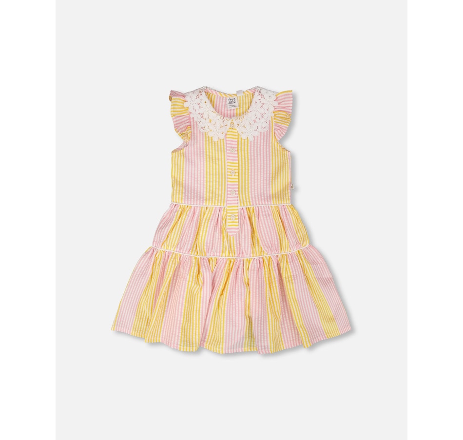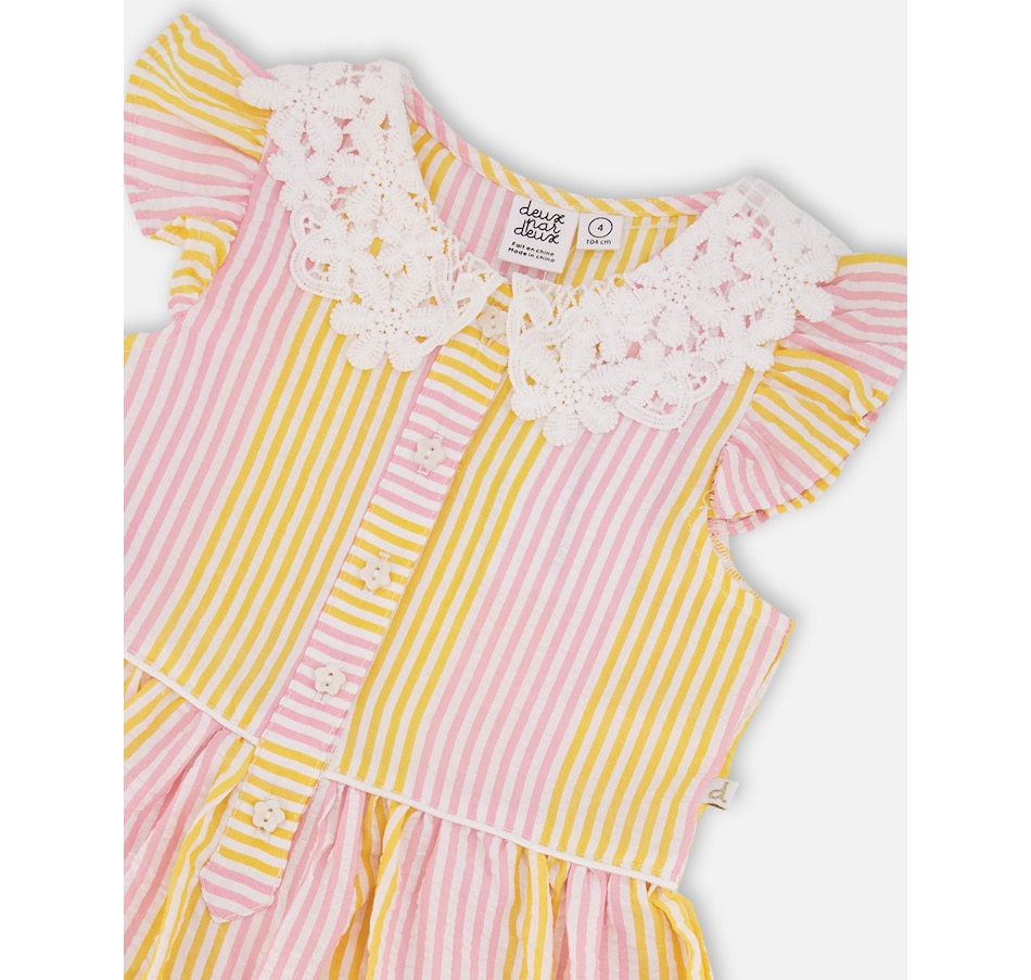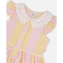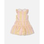 Charming and bright, our sleeveless dress with Peter Pan crochet collar in pink and yellow stripes is a summer essential. This casual dress features flutter sleeves, a scalloped crochet Peter Pan collar, a button-front opening, and a gathered tiered skirt for playful volume. Perfect for sunny days, it pairs beautifully with other pieces from the “Explosion Of Daisies” collection.