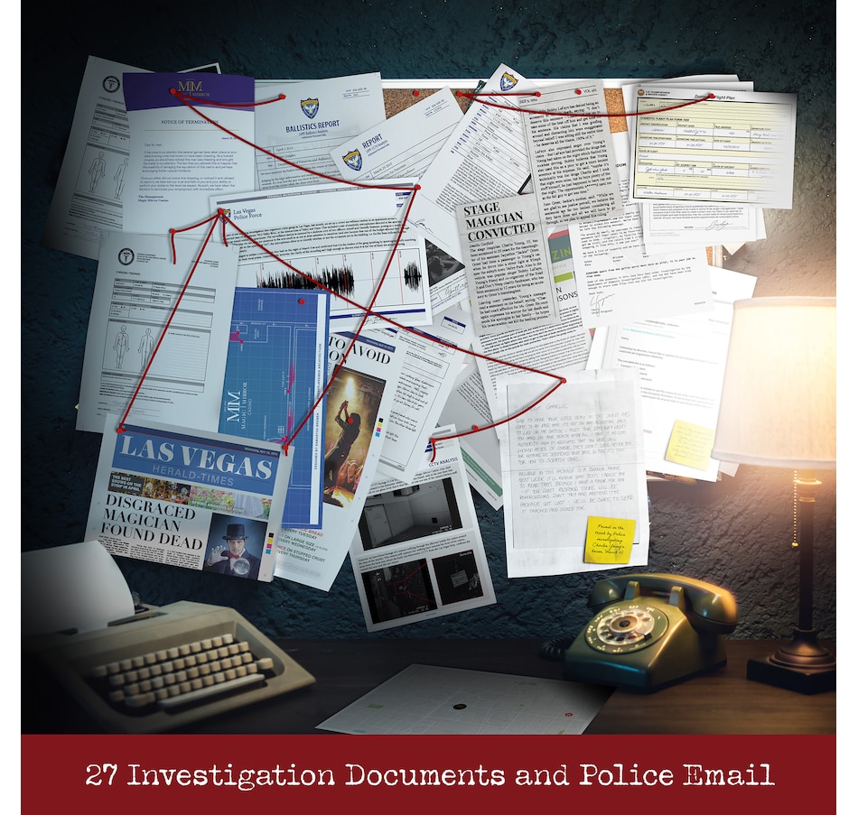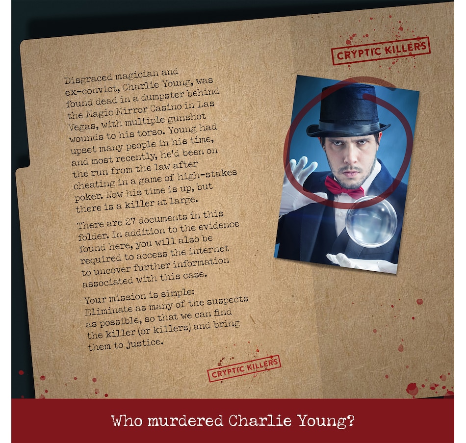 Disgraced magician and ex-convict, Charlie Young, was found dead in a dumpster behind the Magic Mirror Casino in Las Vegas, with multiple gunshot wounds to his torso. Young had upset many people in his time and most recently, he'd been on the run from the law after cheating in a game of high-stake poker. Now his time is up, but there is a killer at large. The evidence has been collected for you, it’s your job to piece it all together and work out who it was that killed the victim!