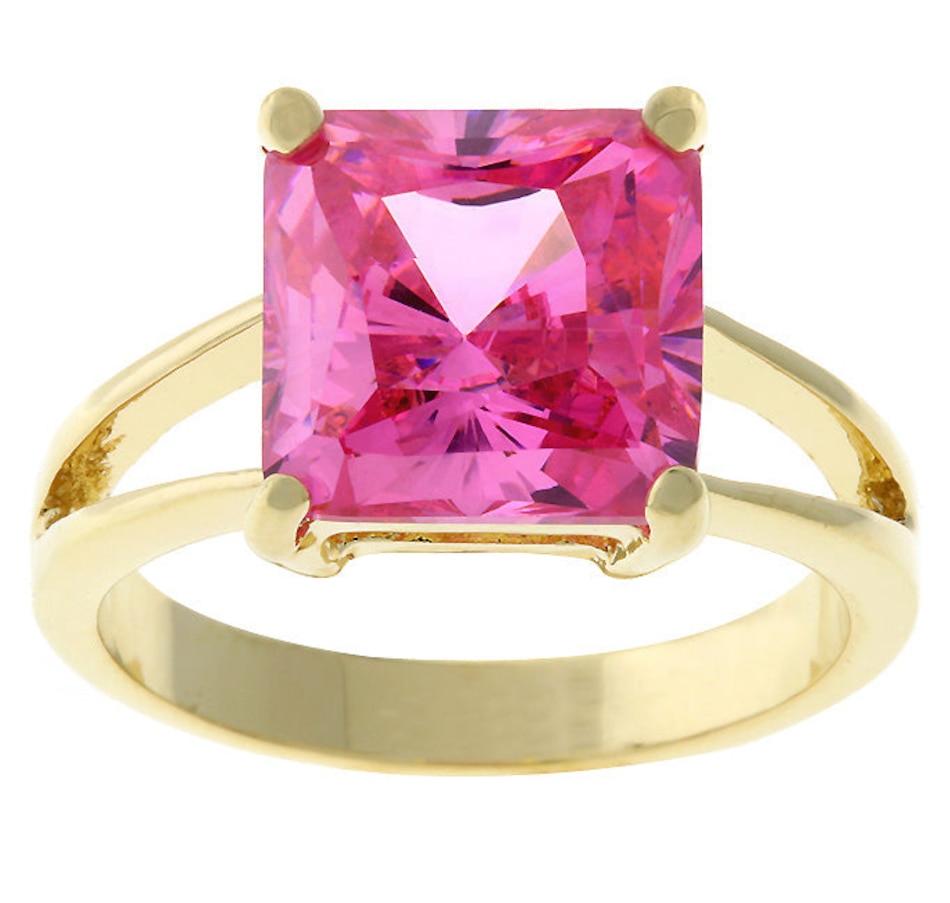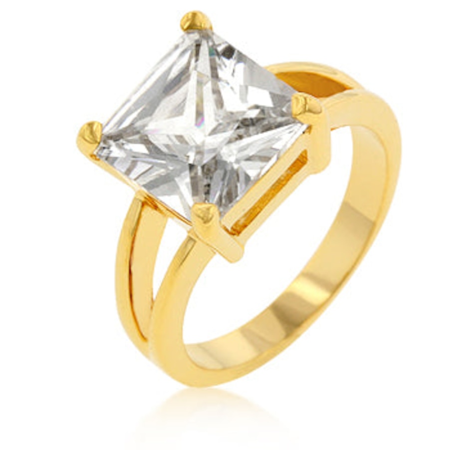 Feminine and elegant. Simple and solitaire. Fashioned with a luminous 5 carat cubic zirconia this ring is a lovely addition to any collection. 18k plated gold is achieved using an electroplating process that coats the item with heavy layers of 18k Gold and color-treated to display a perfect 14k Hamilton gold color.