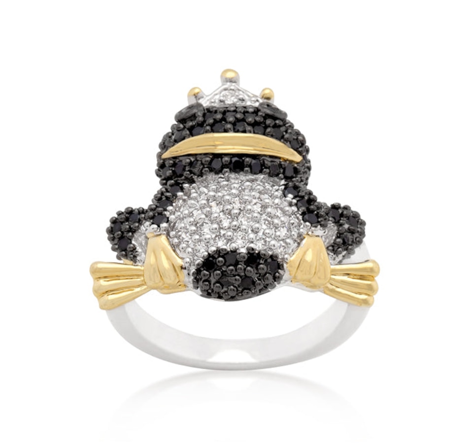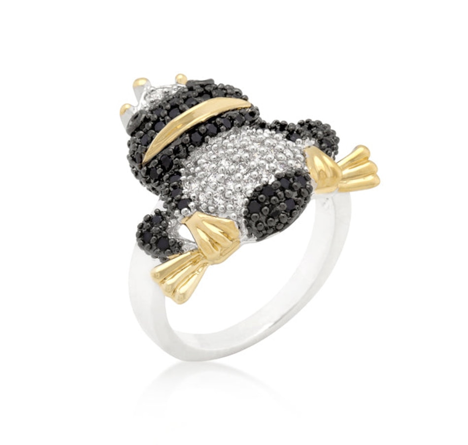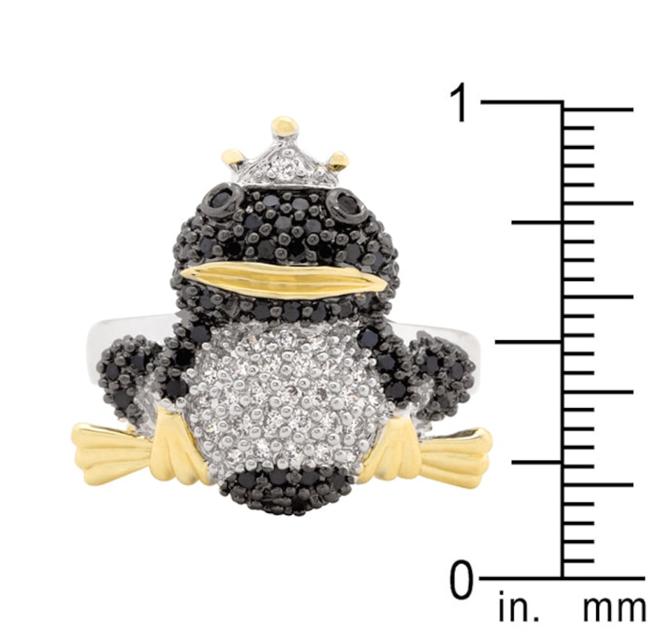 This statement animal ring features a cubic zirconia encrusted Frog Prince in and . Our two-tone and tri-tone process use 18k gold that electroplated coating the item with heavy layers of 18k gold giving it that 14k hamiliton gold polished look. The silver tone is achieved by applying a heavy coating of genuine to the item giving is a lustrous silver tone high polish.