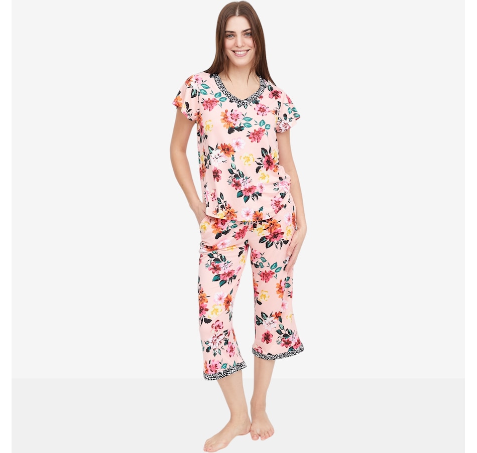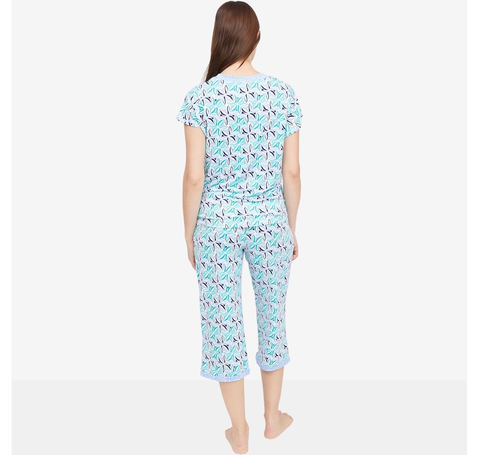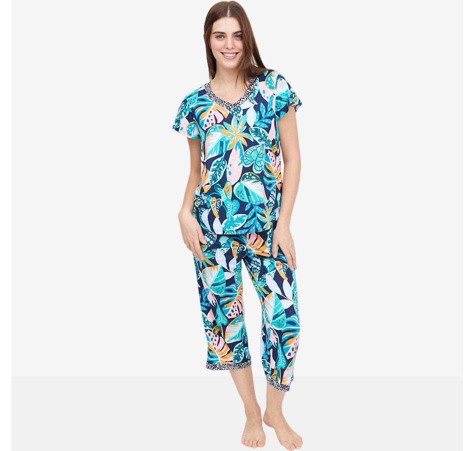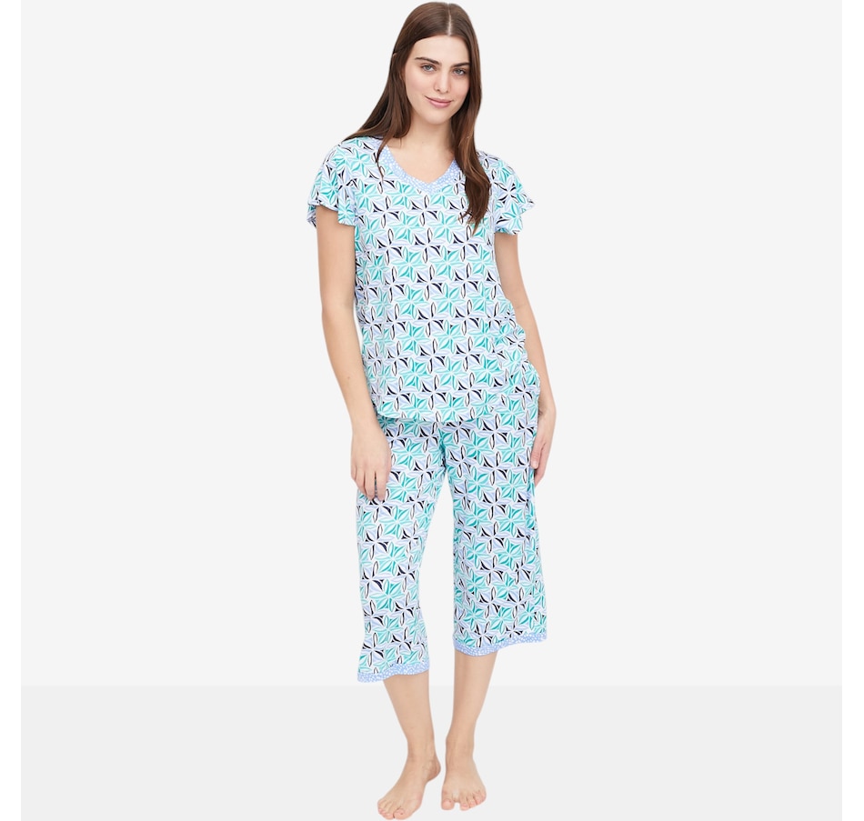 The Cool & Airy print v‑neck and capri PJ set from Cuddl Duds is designed for relaxed, easy comfort. The top measures 26" from the high point of the shoulder and features a twin print v‑neckline, flounce sleeves, and printed back neck tape at the neckline. A shirttail hem with side vents completes the silhouette.
