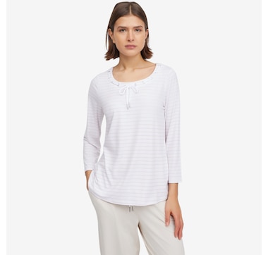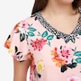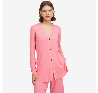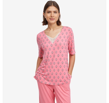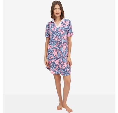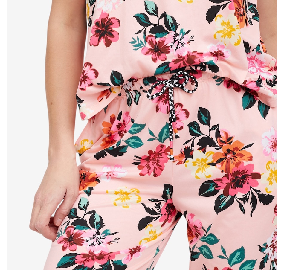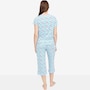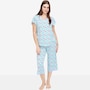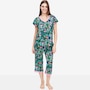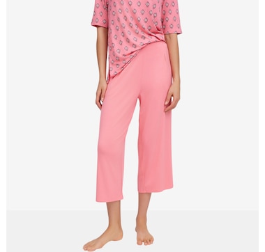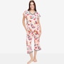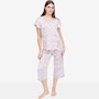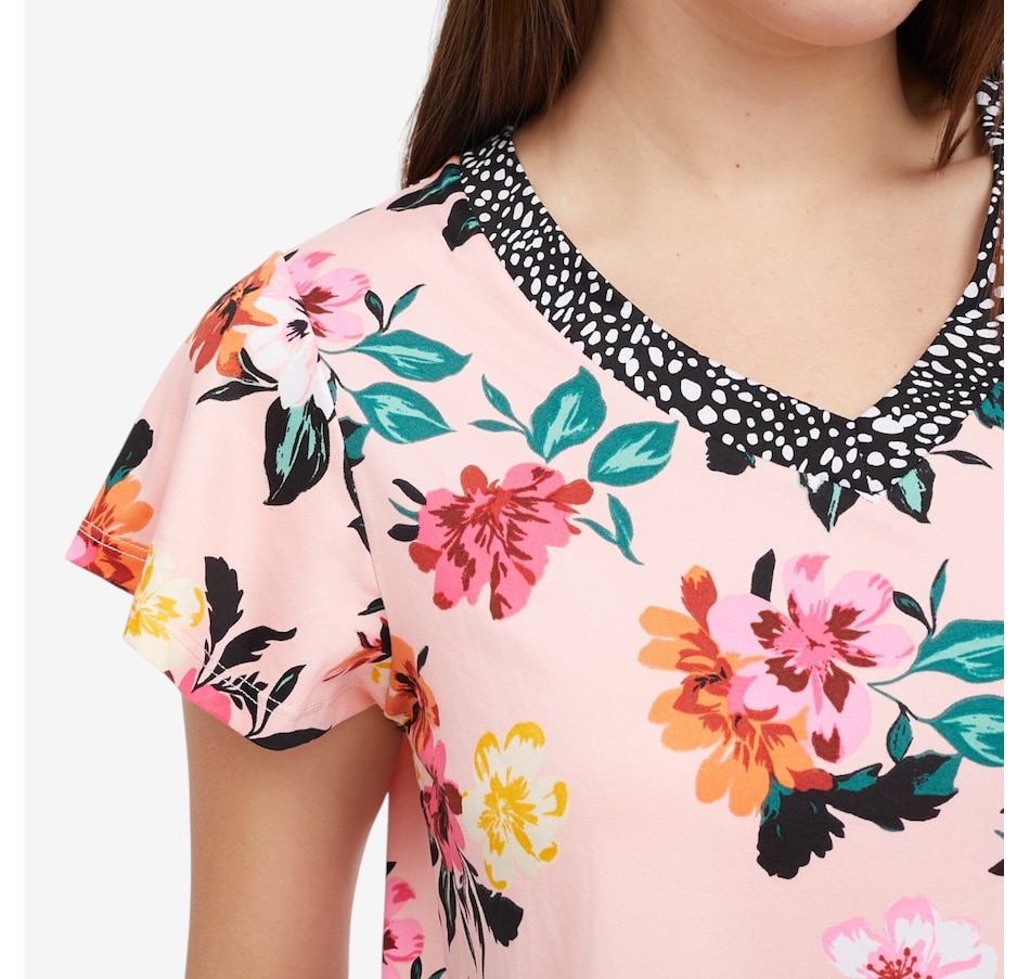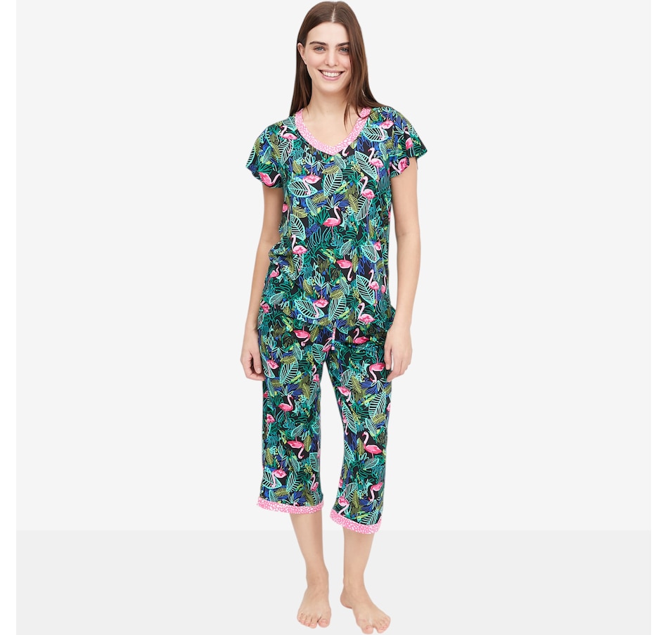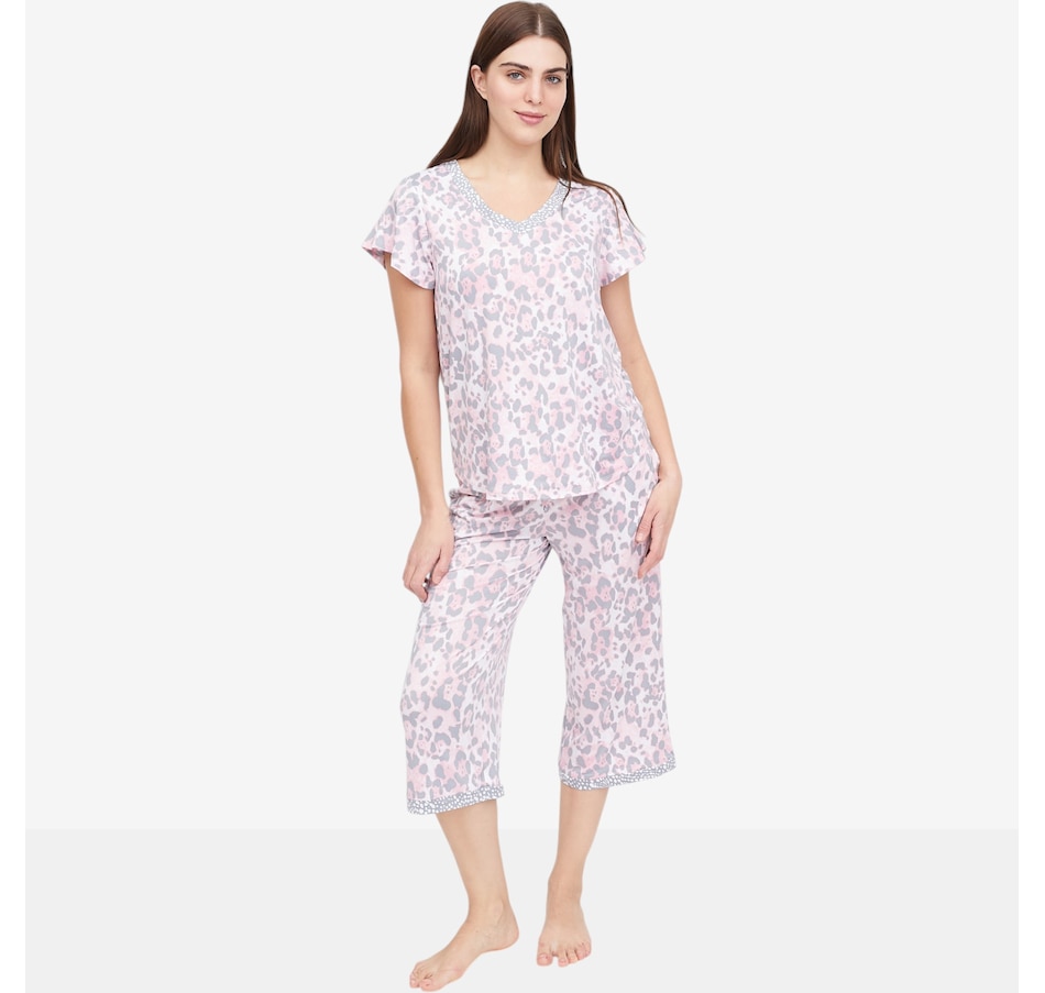 The Cool & Airy print v‑neck and capri PJ set from Cuddl Duds is designed for relaxed, easy comfort. The top measures 26" from the high point of the shoulder and features a twin print v‑neckline, flounce sleeves, and printed back neck tape at the neckline. A shirttail hem with side vents completes the silhouette.