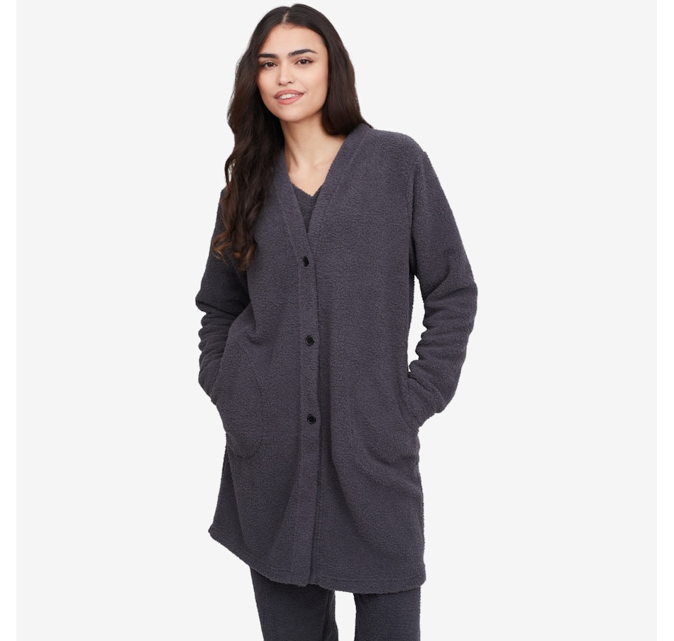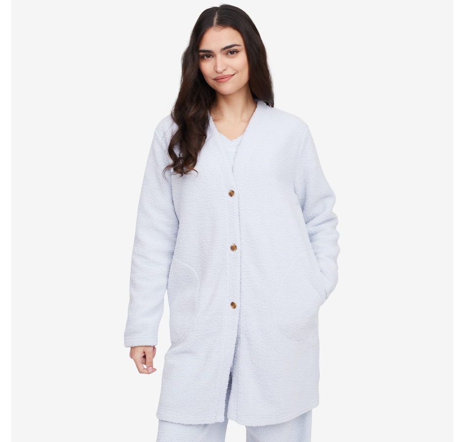 Cozy up in effortless style with this marshmallow knit button front cardigan, the perfect layering piece for lounging or casual days. Featuring a flattering v-neckline and a functional button-front closure, it offers both comfort and versatility. Stitched-down side seam pockets add convenience, while the soft marshmallow knit fabric delivers warmth with a lightweight feel. Whether you’re relaxing at home or adding a chic touch to your everyday look, this cardigan is your go-to for plush comfort and timeless design.
