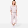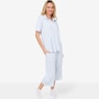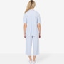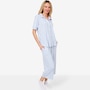 This set is composed of a button up shirt with a capri pant. The top is composed of a functional placket with matte buttons and contrast stitching, ticking twill tape at the back neck, and a stripe play at the collar. The extended short sleeves finish in a cuff, and there's also a shirt tail hem, side vents, and the Huggy logo. The bottom features a foldover waistband with encased elastic, side seam pocket, and a ticking twill tape drawcord with thread wraps.
