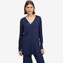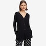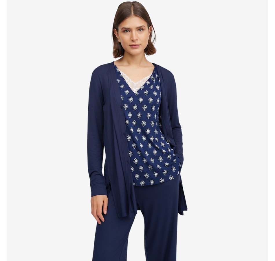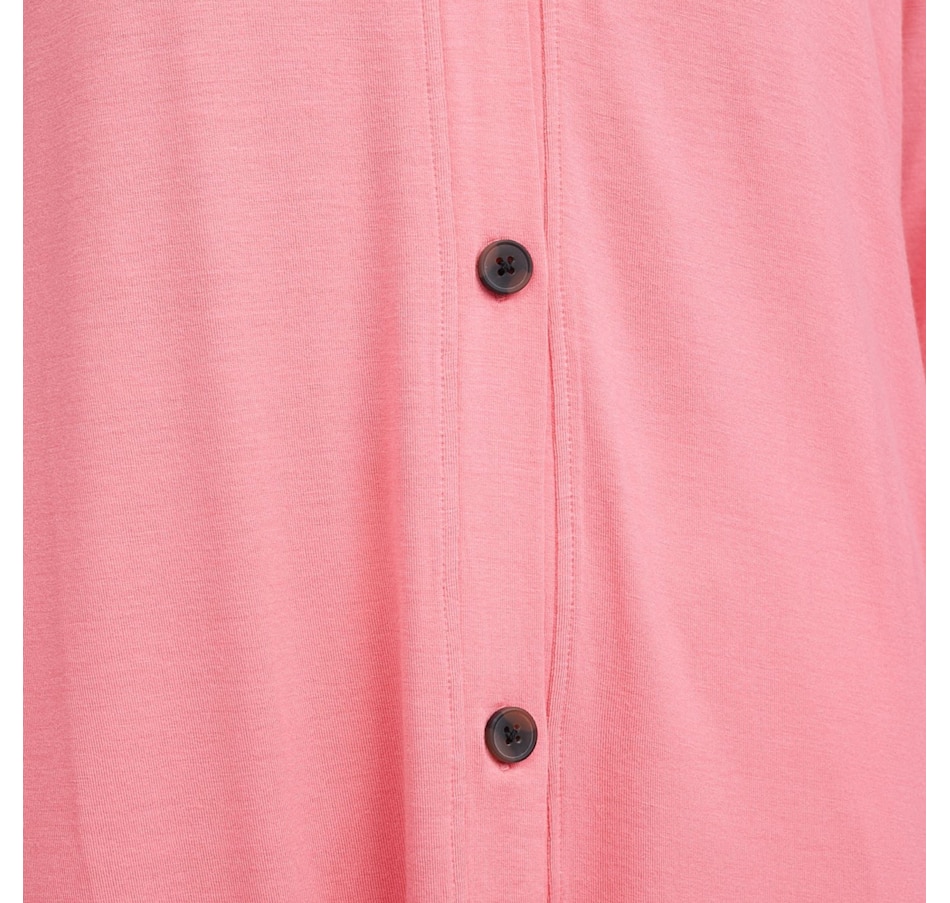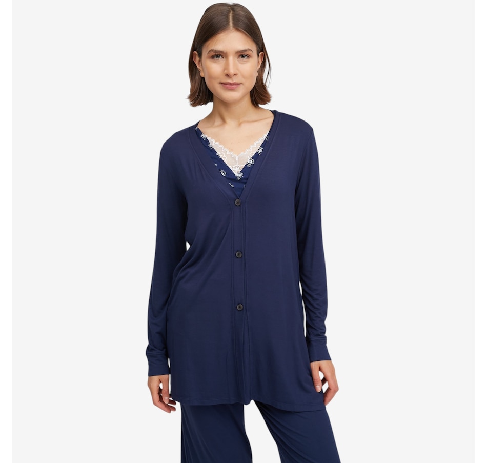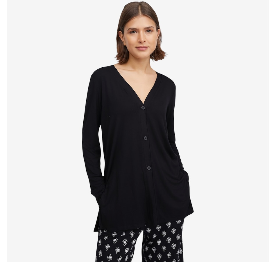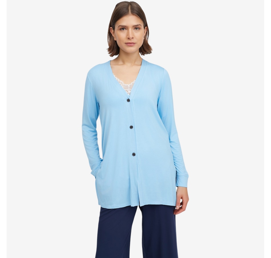 The Soft Stretch cardi from Cuddl Duds offers relaxed comfort and an easy-to-wear design. Measuring 30" at the centre back, this long‑sleeve cardigan features a V-neckline with a functional button‑front placket band. A back‑neck elastic locker loop adds a practical detail, while cuff sleeve openings and side slits complete the silhouette. The Huggy logo provides a signature finishing touch.