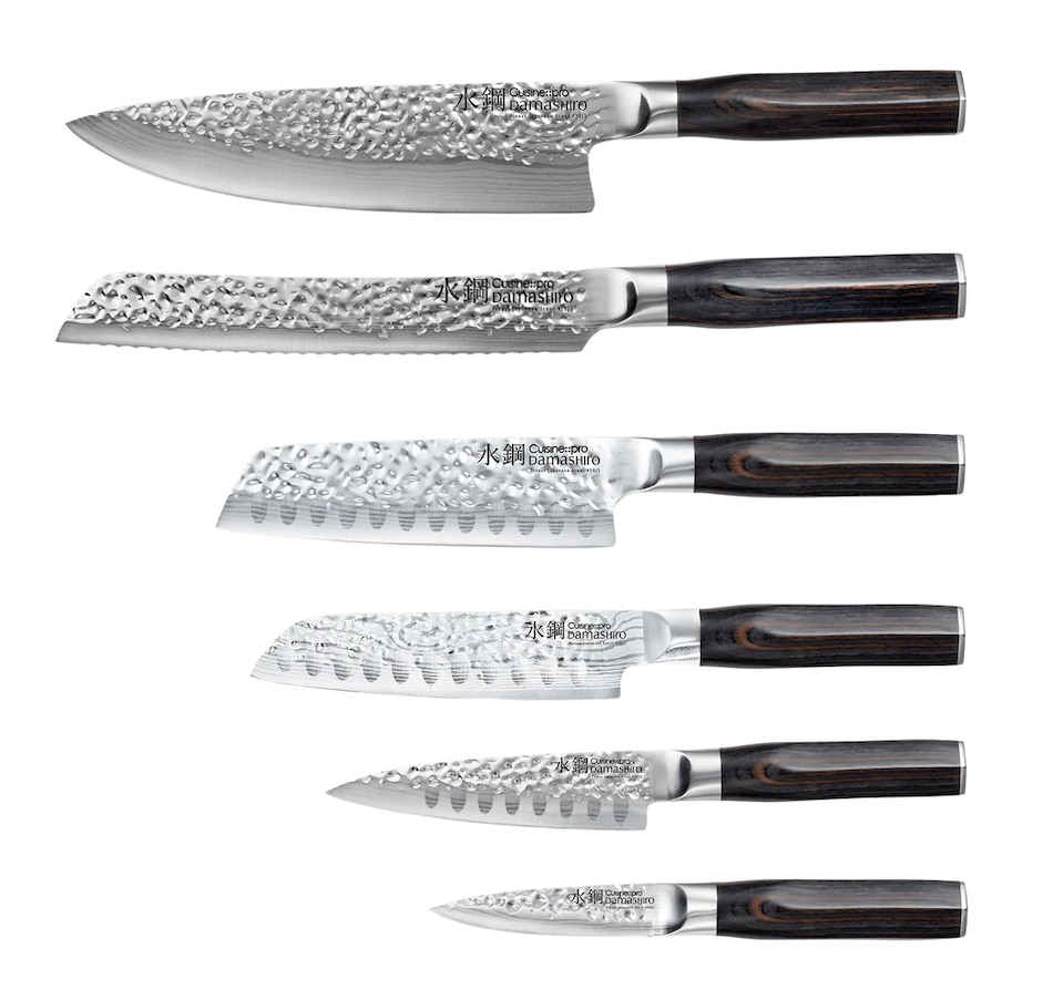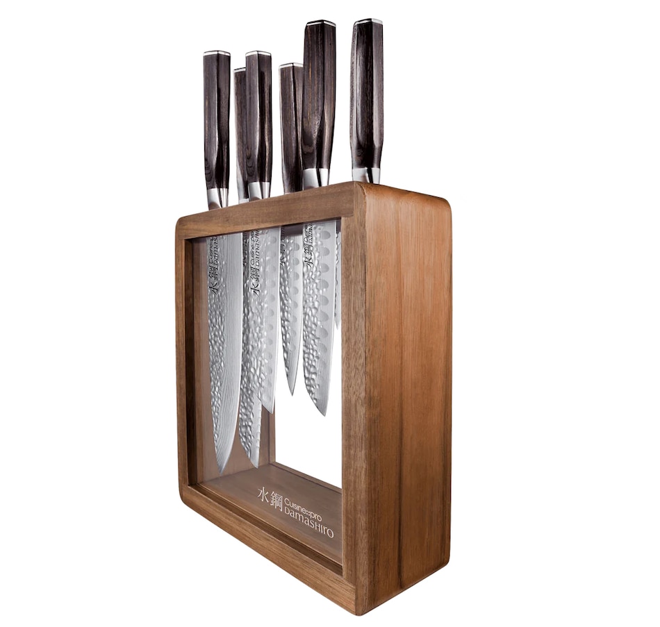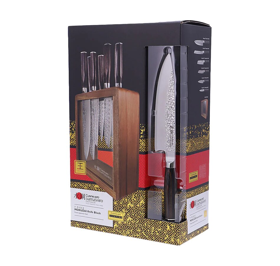 Complete your kitchen with the Cuisine::pro Damashiro Emperor Mokuzai 7-piece knife block. Featuring a frame made of the finest quality walnut wood with glass panels, your Damashiro knives will be the centre of your kitchen and take your culinary experience to the next level.