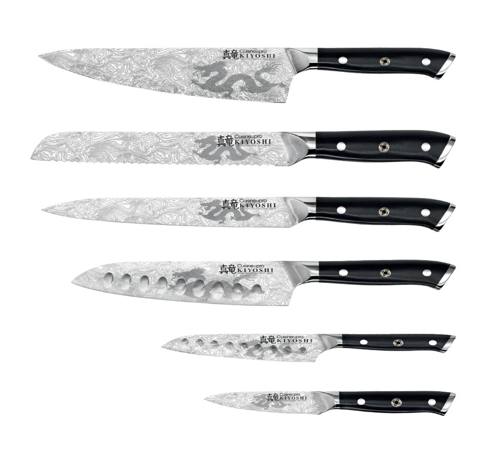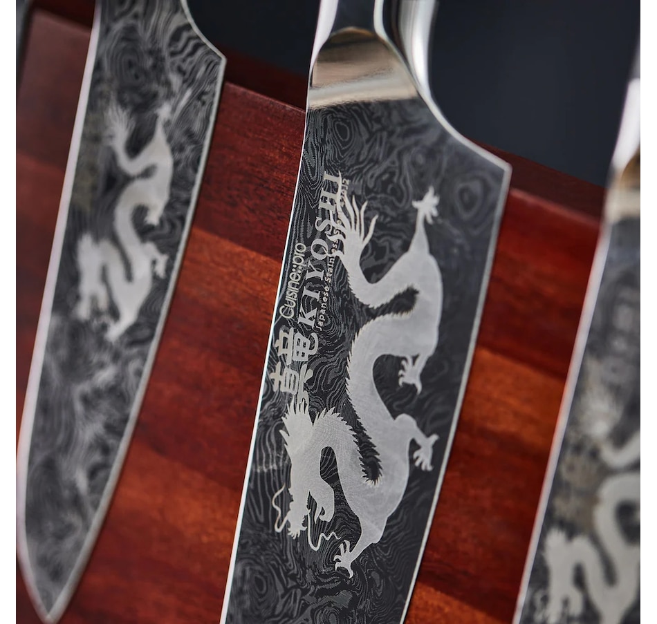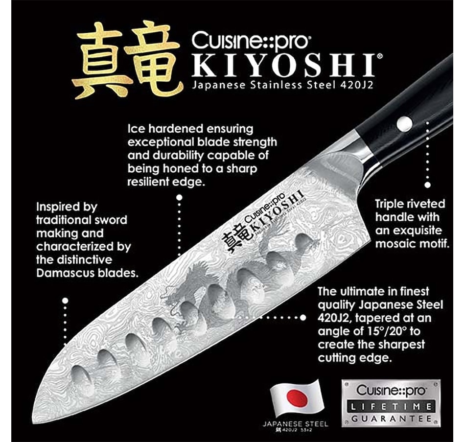 The Cuisine::pro Kiyoshi range by The Custom Chef features distinctive Damascus-type blades, inspired by traditional Japanese craftsman and Samurai sword makers, being characteristic of banding and mottling reminiscent of flowing water. Each blade also has a distinctive trademark dragon insignia. Cuisine::pro Kiyoshi knives have been crafted from the finest Japanese steel 420J2 and ice-hardened ensuring superior blade strength and durability. The blade construction has been inspired by century old manufacturing techniques to create a super sharp cutting edge which holds a greater edge retention. This technique is favored by traditional Japanese craftsman. The steel has been mined in the same Japanese region of Chuo-Ku Chiba since the middle of the last century. Each knife in the Kiyoshi range has been engineered and tested to meet Rockwell 53 specification, accounting for the blades hardness, and optimal performance.