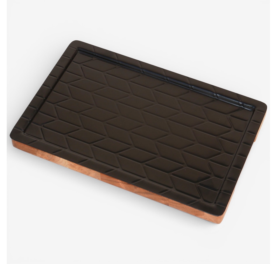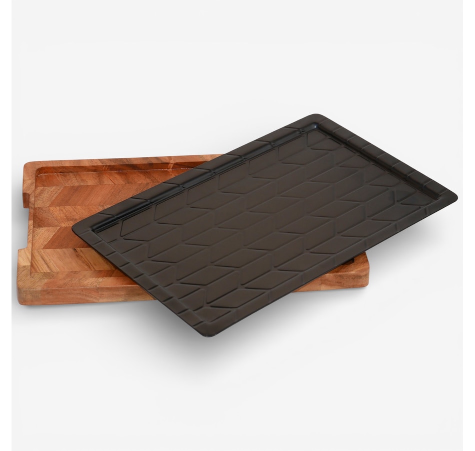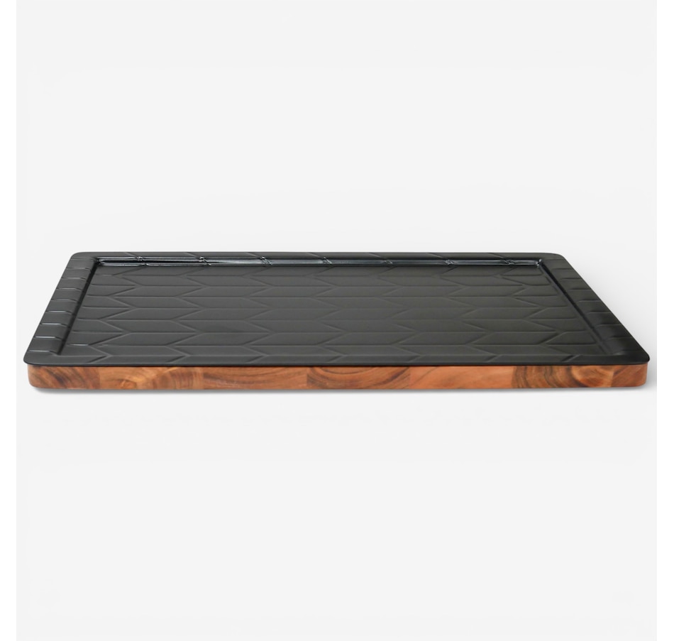 This versatile and practical cutting board from Curtis Stone is crafted from durable acacia wood and featuresa a decorative chevron pattern. Its reversible design, with one side for prepping and the other for serving, makes it ideal for meal prep, family cooking and serving guests, plus it also has a thawing tray, in which a metal plate naturally conducts heat to thaw frozen foods quickly. The thawing plate is also removable, working independently from wooden cutting board and allowing you to thaw meats on the plate while using the board to cut your vegetables, saving you time and need for an extra cutting board.