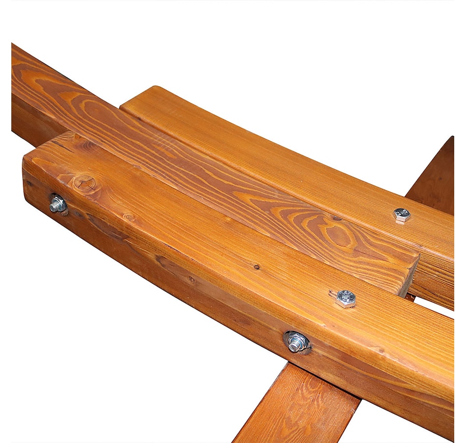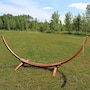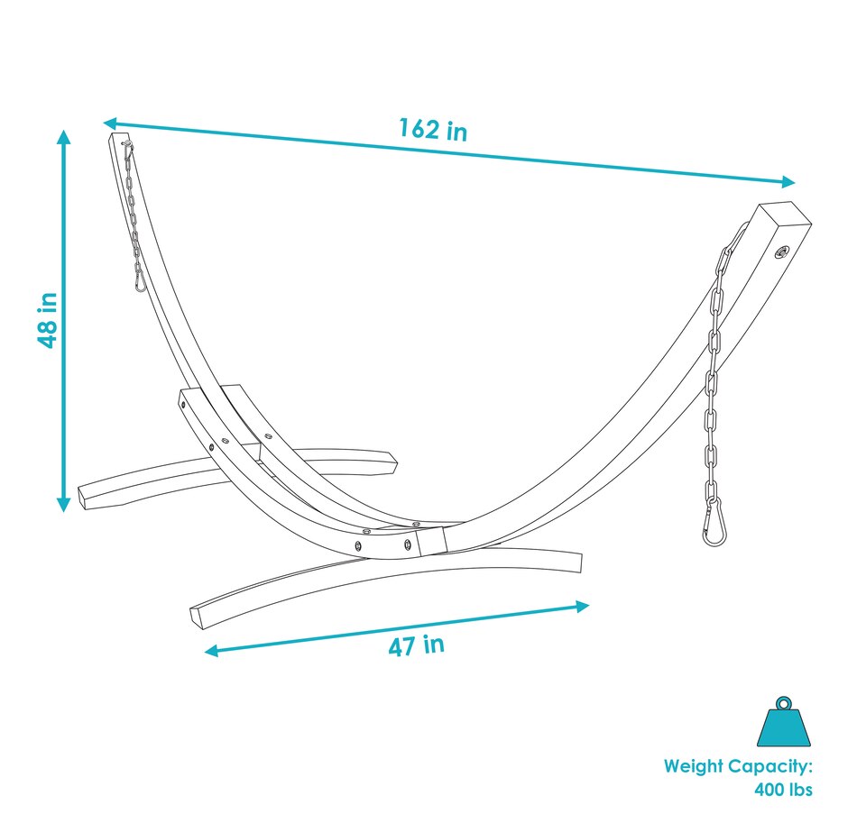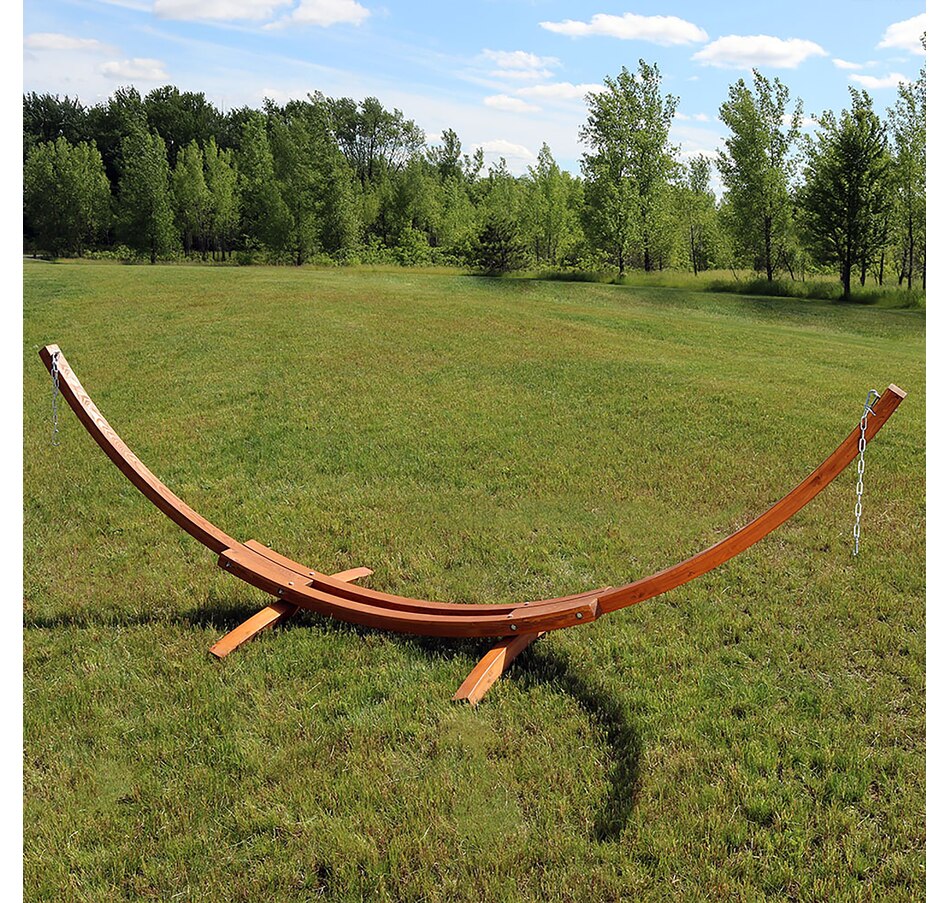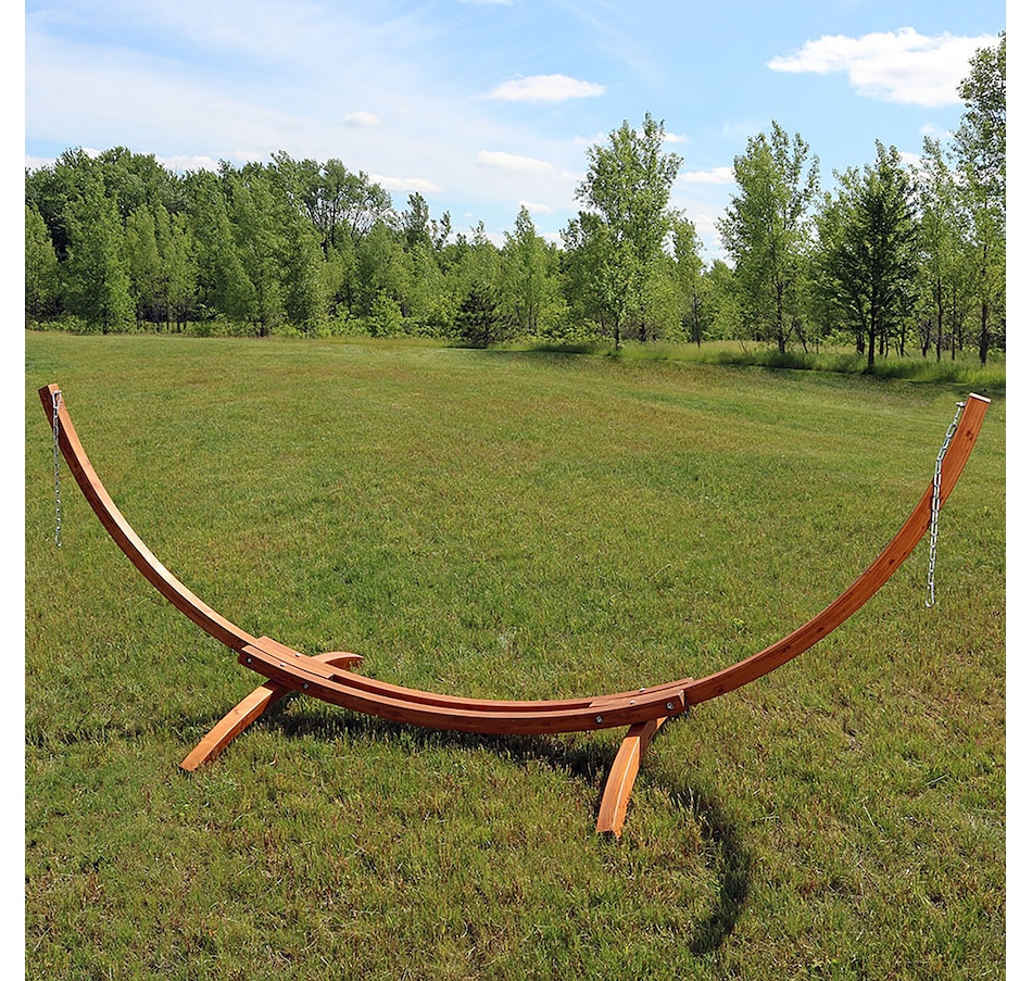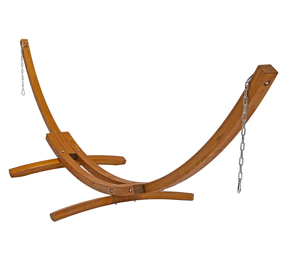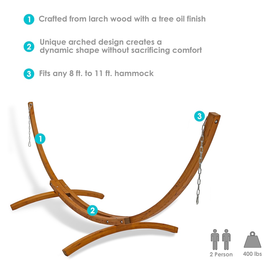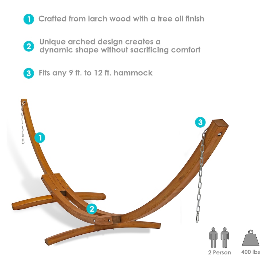 With its unique shape and design, this curved arc hammock stand provides ultimate comfort and relaxation to unwind from a busy day. Made of durable and long-lasting larch wood with a non-toxic, medium-tone finish made from tree oil, this stand is a great aesthetic addition to any outdoor living space. The sturdy wood is sure to stand strong all season long, and the finish makes this stand even more resistant to the elements outdoors. Soak up the sun and relax with this sleek hammock stand. Simply hang 9 to 12 ft hammocks on this stand and enjoy lounging in the yard, patio, deck, porch, campsite, or other area where no trees are around. This stand has a 400 lb weight capacity and can comfortably hold a person and a friend as they enjoy naps, snacks, and good conversations all day and night.