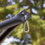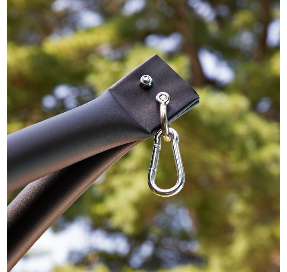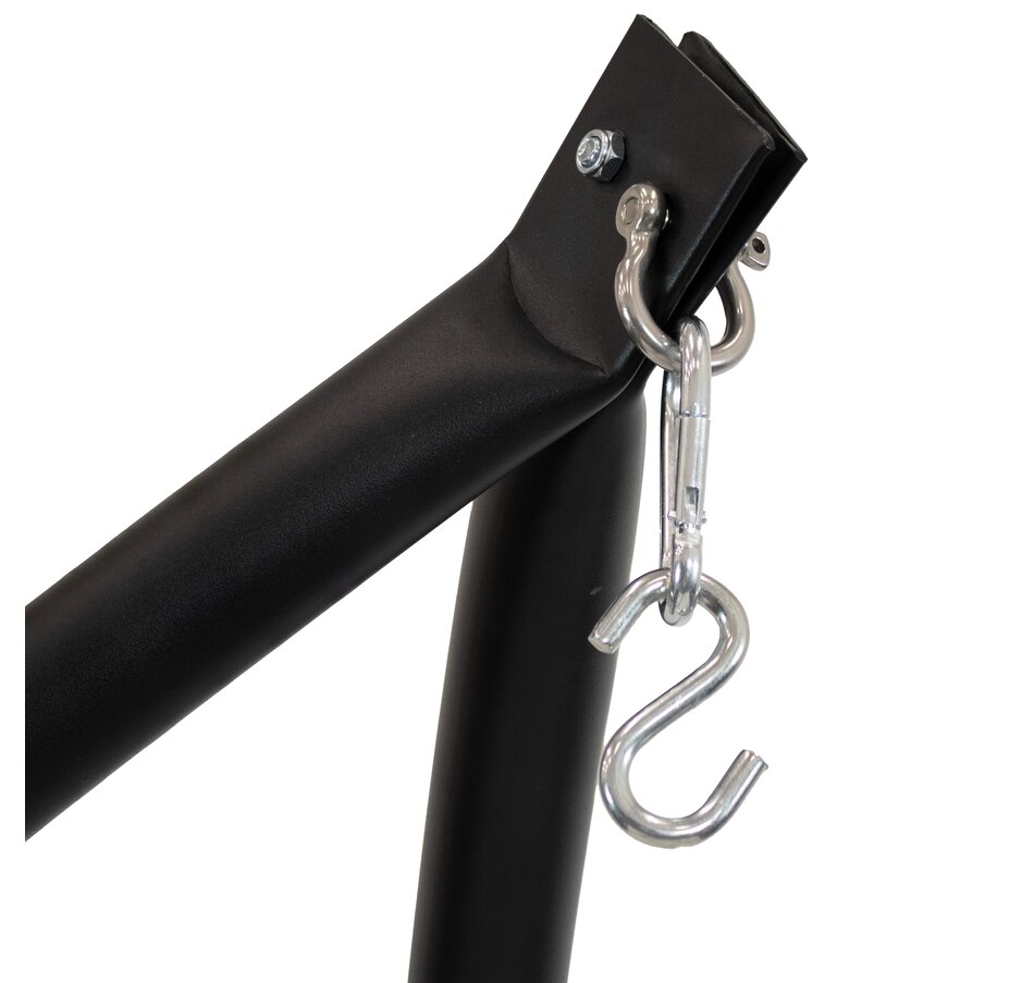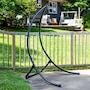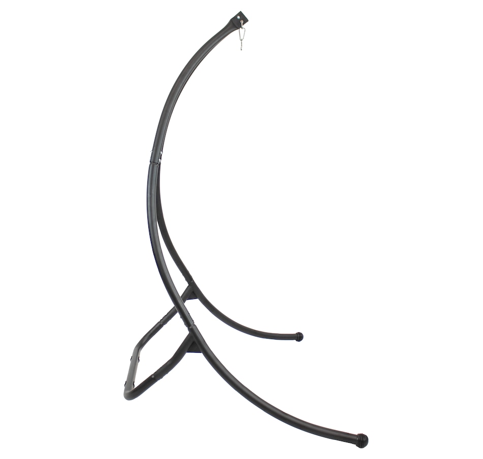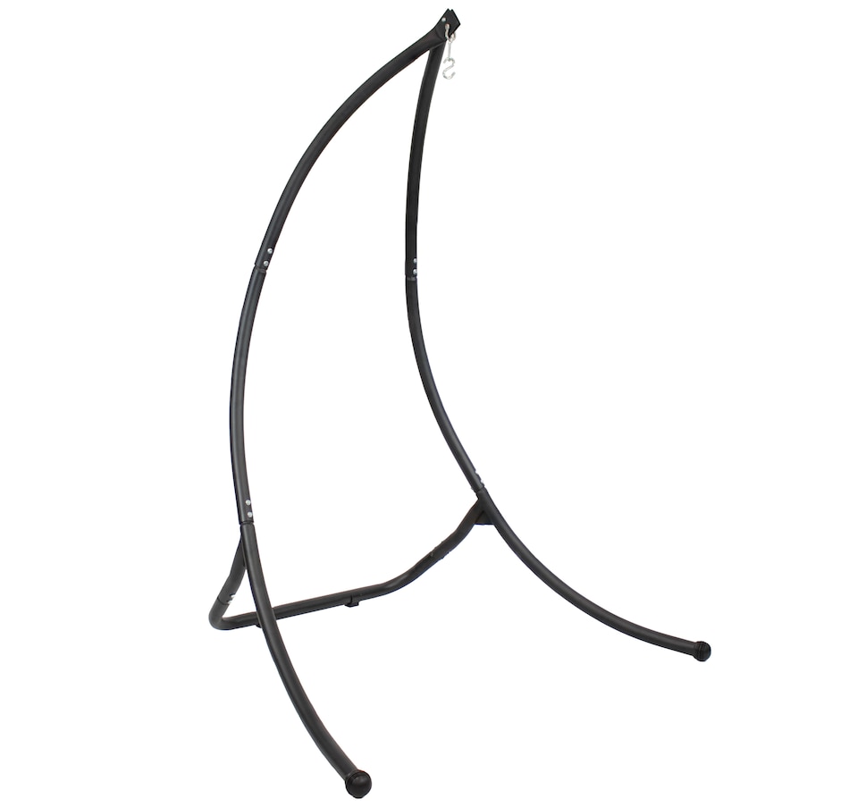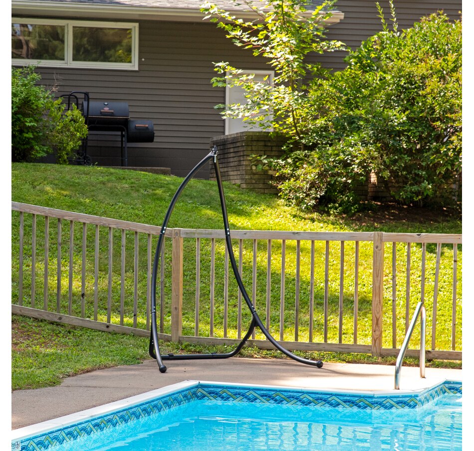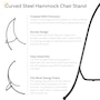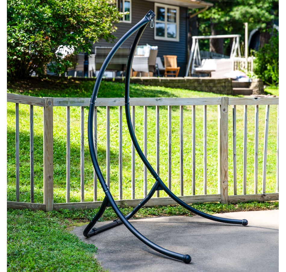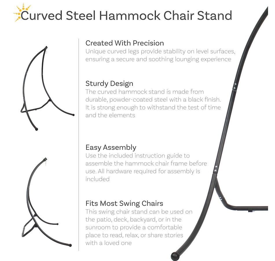 Whether indoors or outdoors, transform any space into a sanctuary of relaxation with this hammock swing chair stand. Created with precision, its unique curved legs provide stability on level surfaces, ensuring a secure and soothing lounging experience. Constructed from robust powder-coated steel, this stand withstands the test of time and the elements. The sleek black finish adds a touch of sophistication to any outdoor or indoor space, seamlessly complementing all decor styles. This versatile stand accommodates most hammock chair styles, offering unmatched compatibility and flexibility. Carefully assemble the stand using the included assembly instructions before hanging a hammock chair (not included). Enjoy quiet evenings on the patio, deck, or porch with a good book or spend time with a loved one comfortably reclining outdoors with help from this steel hammock chair stand.