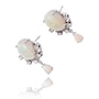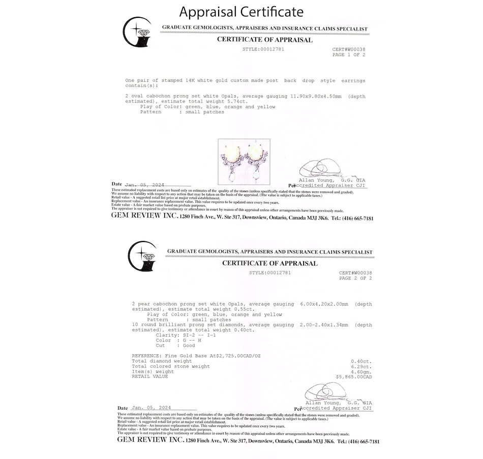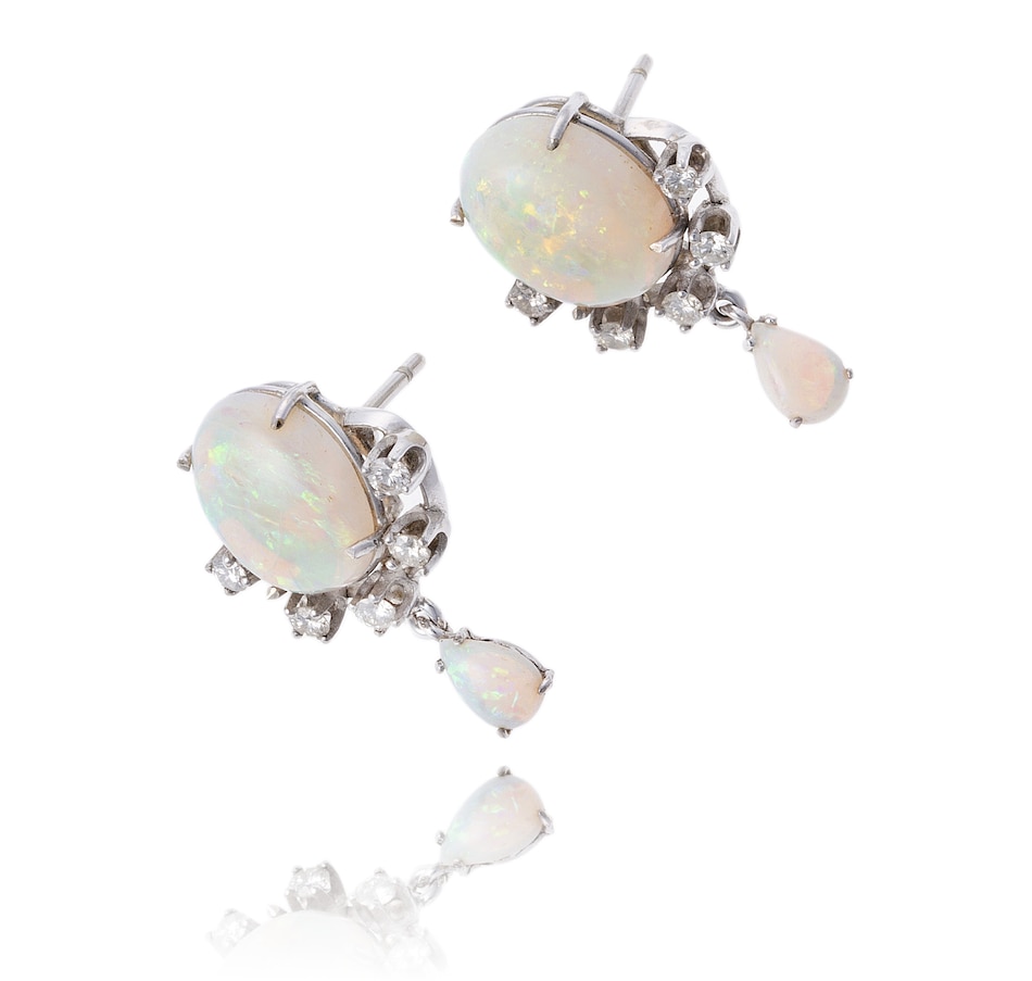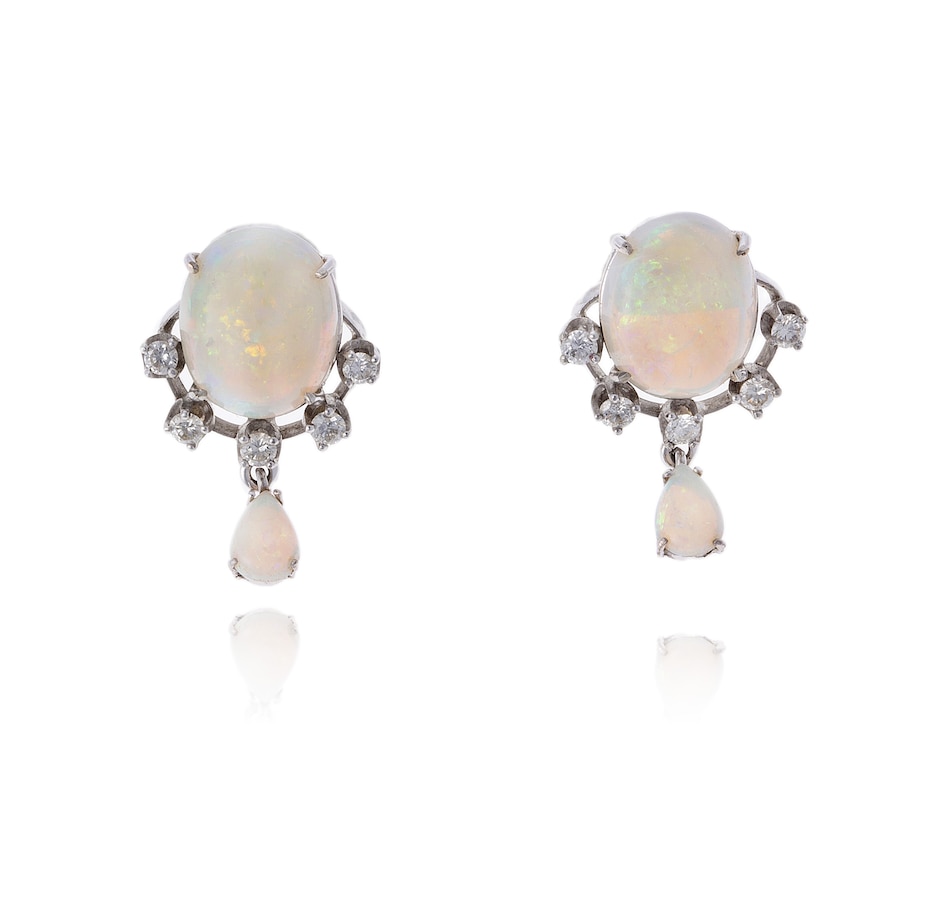• Specs: (2) oval shaped cabochon cut opals (5.74 av. ctw), (2) cabochon cut pear shaped opals (0.55 av. ctw), (10) round brilliant cut diamonds (0.40 av. ctw)