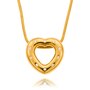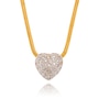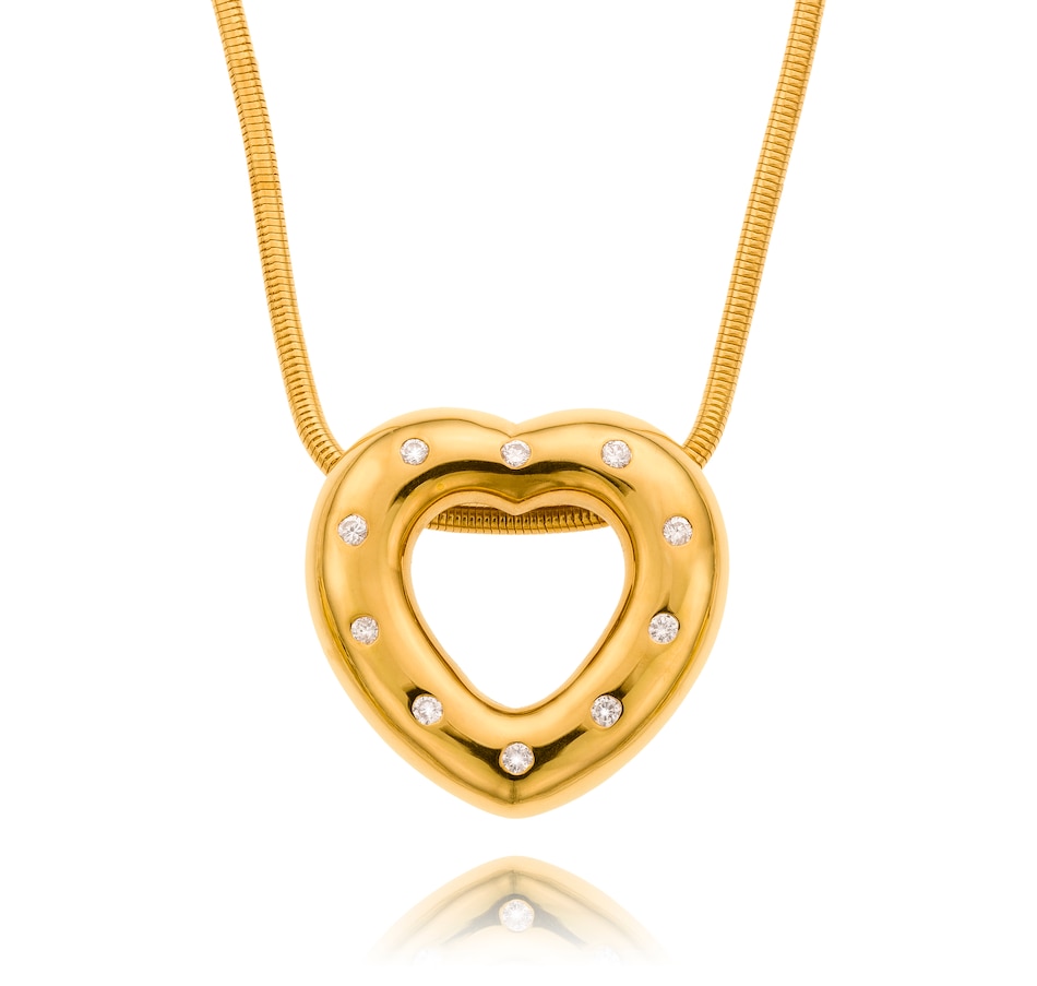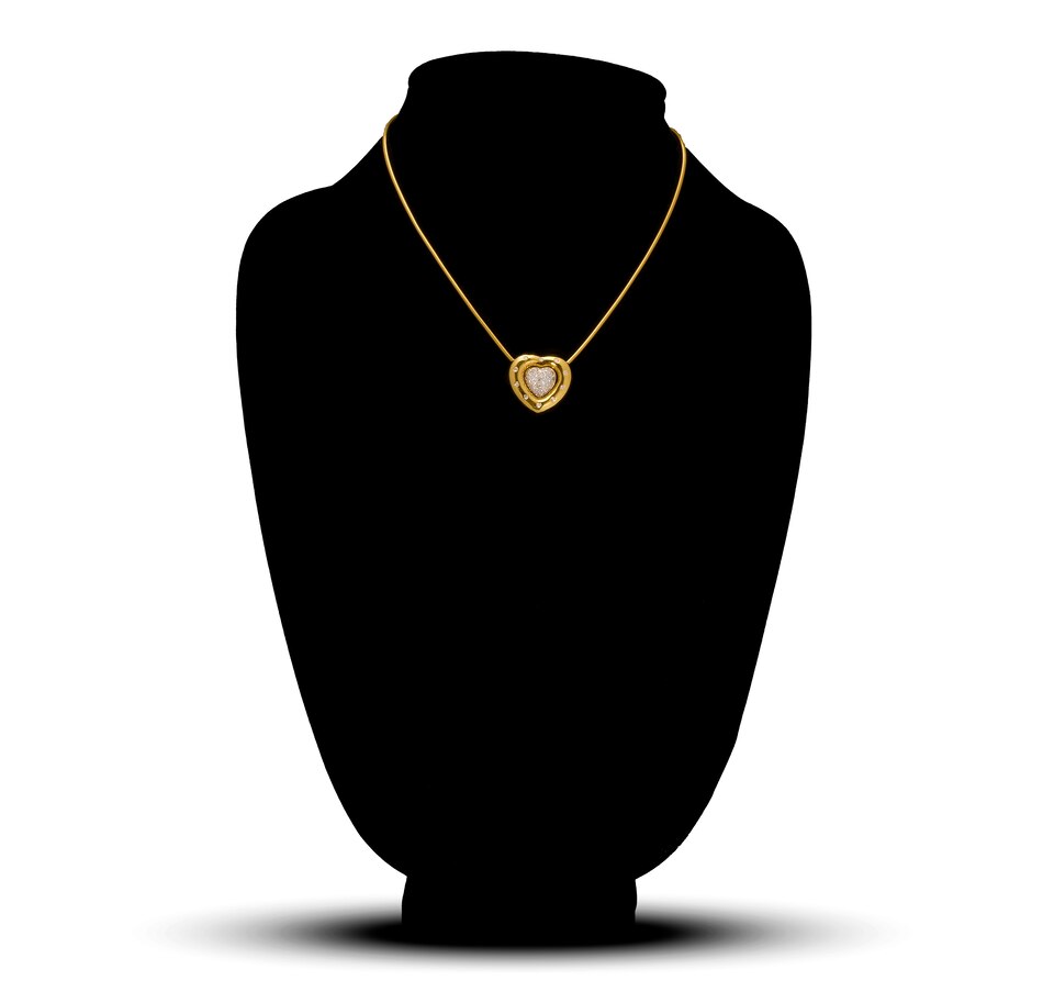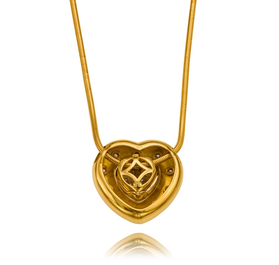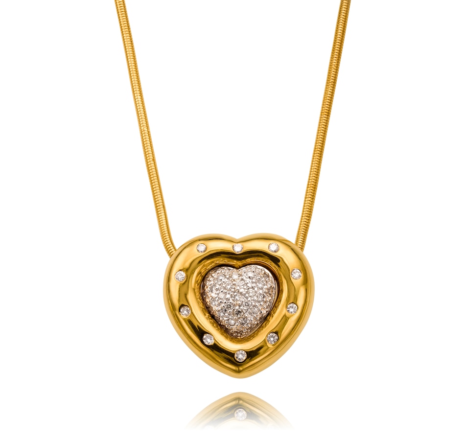 This convertible heart slider pendant is custom crafted in 18kt yellow and white gold and features two distinct construction elements. It is designed to be worn as three separate looks, making it incredibly functional and cost effective as it provides three designs for the price of one. The exterior puffed heart is high polished yellow gold and is gypsy-set with ten diamonds, spaced evenly apart, around the entire perimeter and can be worn alone or with the middle puffed heart insert. The white gold inner heart is domed in shape and is entirely pave-set with diamonds. It also can be worn alone or inserted into the outer heart. Thus, three different looks can be achieved as each of the two fitted pieces can be worn together or each can be worn alone. The forty-four diamonds combine for .60 carats. The back of the heart highlights the two pieces and is open to allow the light to enter and reflect through the diamonds. A 40cm (16") snake chain with lobster claw clasp feeds through both of the heart shapes keeping the piece balanced on the decollate.