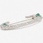 Adding a luxurious and unexpected twist, each terminal of the safety pin features a carved emerald. The larger emerald anchors the broader end, while a smaller, complementary stone graces the opposite side. Their deep green hues provide a striking contrast to the icy brilliance of the diamonds, enhancing the brooch's vintage allure. Likely dating to the early 20th century, circa Edwardian to Art Deco period, this brooch captures the refinement and detailed metalwork characteristic of that time, when platinum was prized for both its strength and its ability to hold intricate designs.