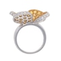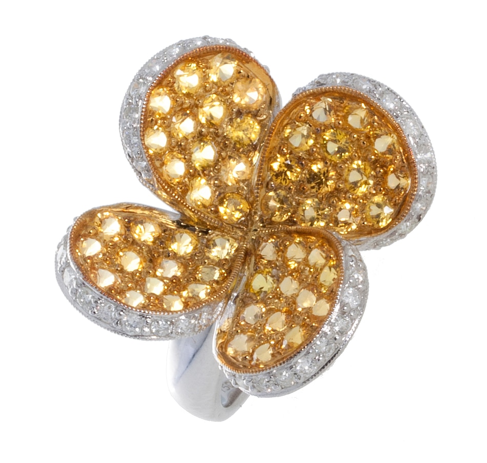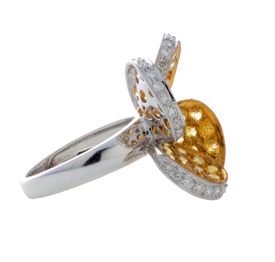 A custom made 18kt white gold multi level overlapping petal floral ring, pave set with yellow sapphires and features a diamond trim.