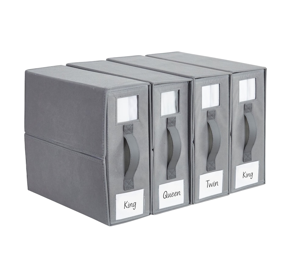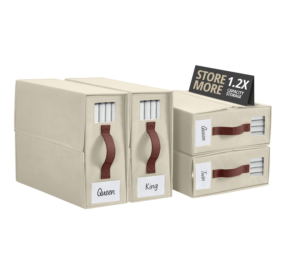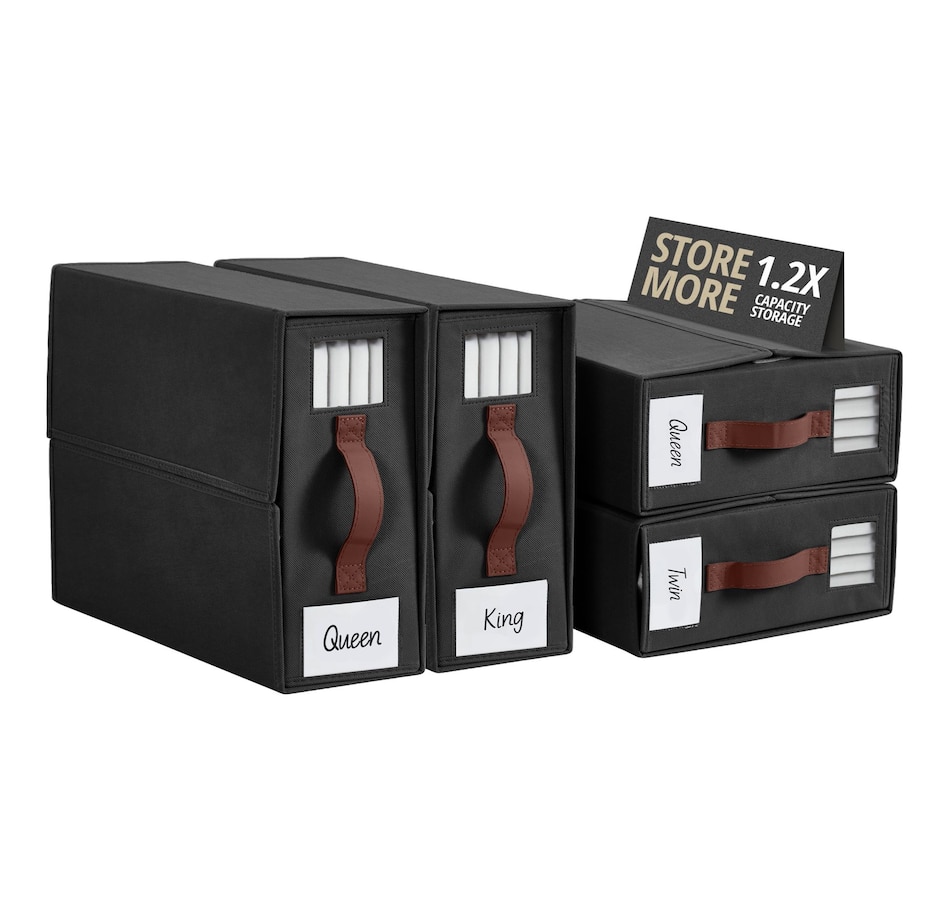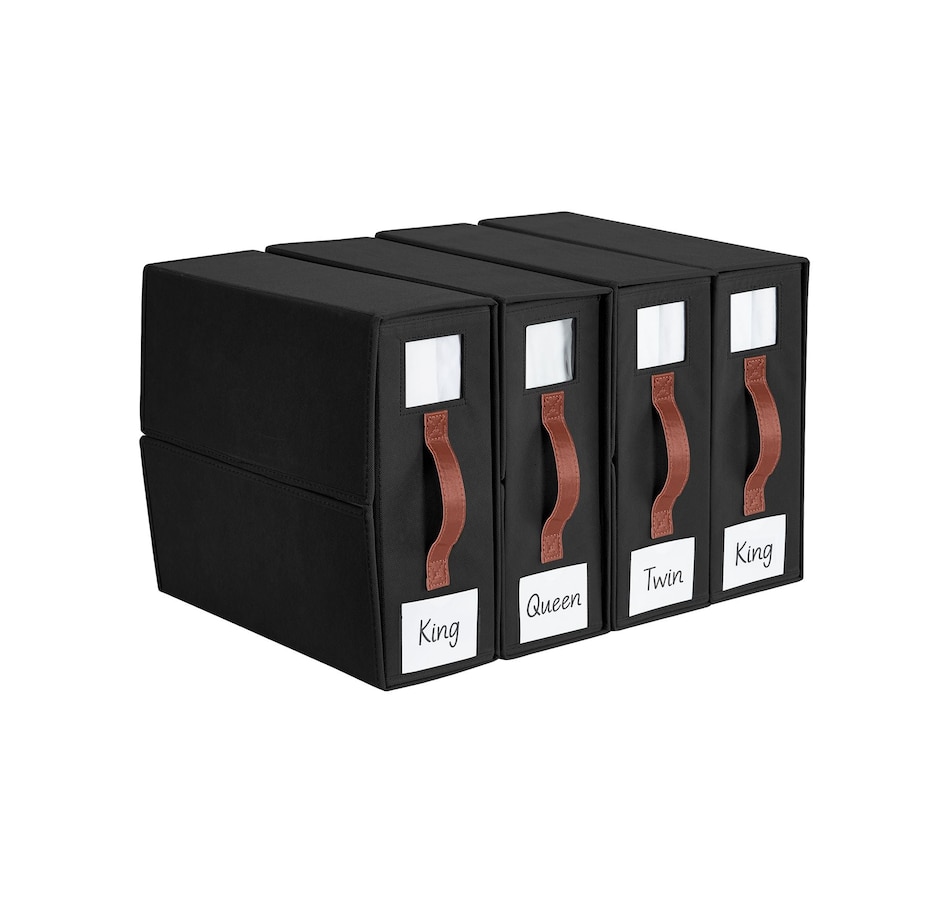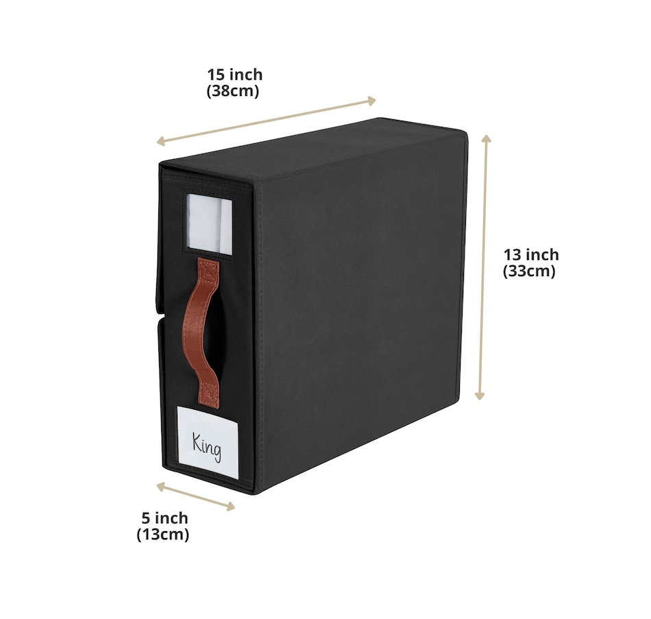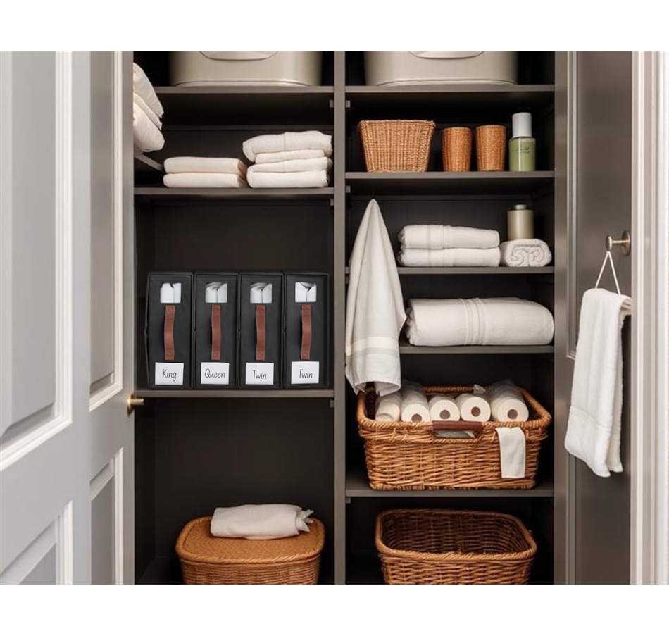 DECOMOMO offers a sheet organizer for linen closet to streamline bedroom storage. The sheet set organizer is designed for efficient bedding storage, keeping your bedroom clutter-free. It features label holders and a clear window for easy identification of stored sheets. The Velcro and zipper closures compress the sheets organizer for linen closet organizer, saving space and providing a secure seal against dust and pests. Each pack includes three sheet storage organizers with dimensions of 15” x 13” x 5”, suitable for queen/king sheet sets or duvet cover sets. Set of 4 Size: 15” (L) x 13” (W) x 5” (H) / 38cm (L) x 33cm (W) x 13cm (H) Model: 23110-4P