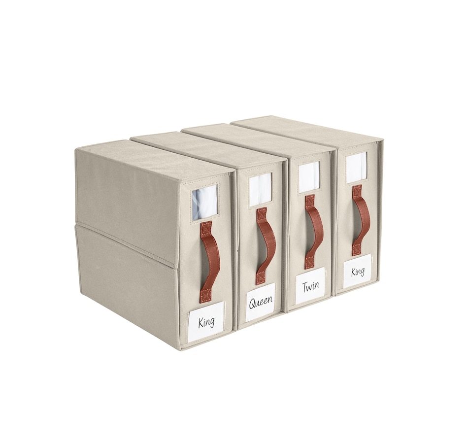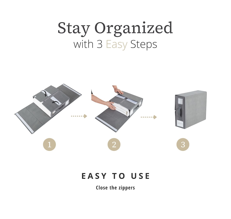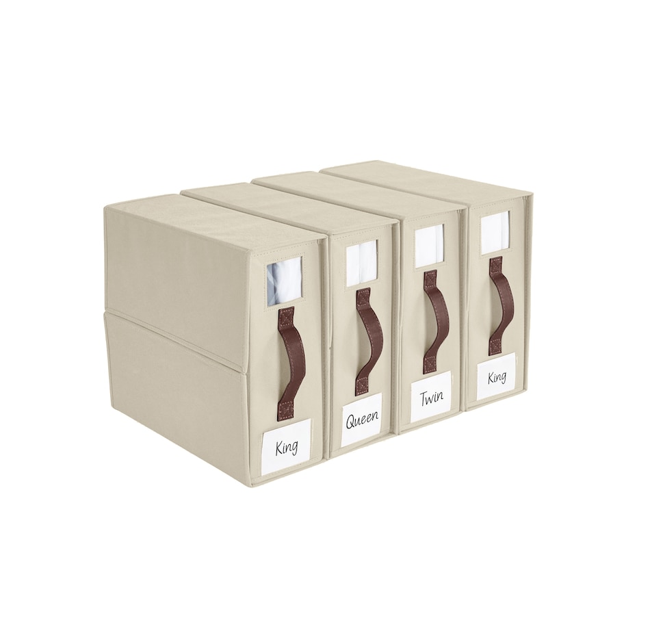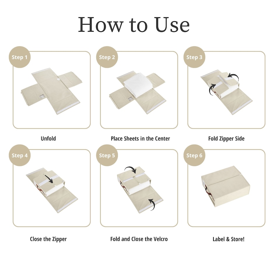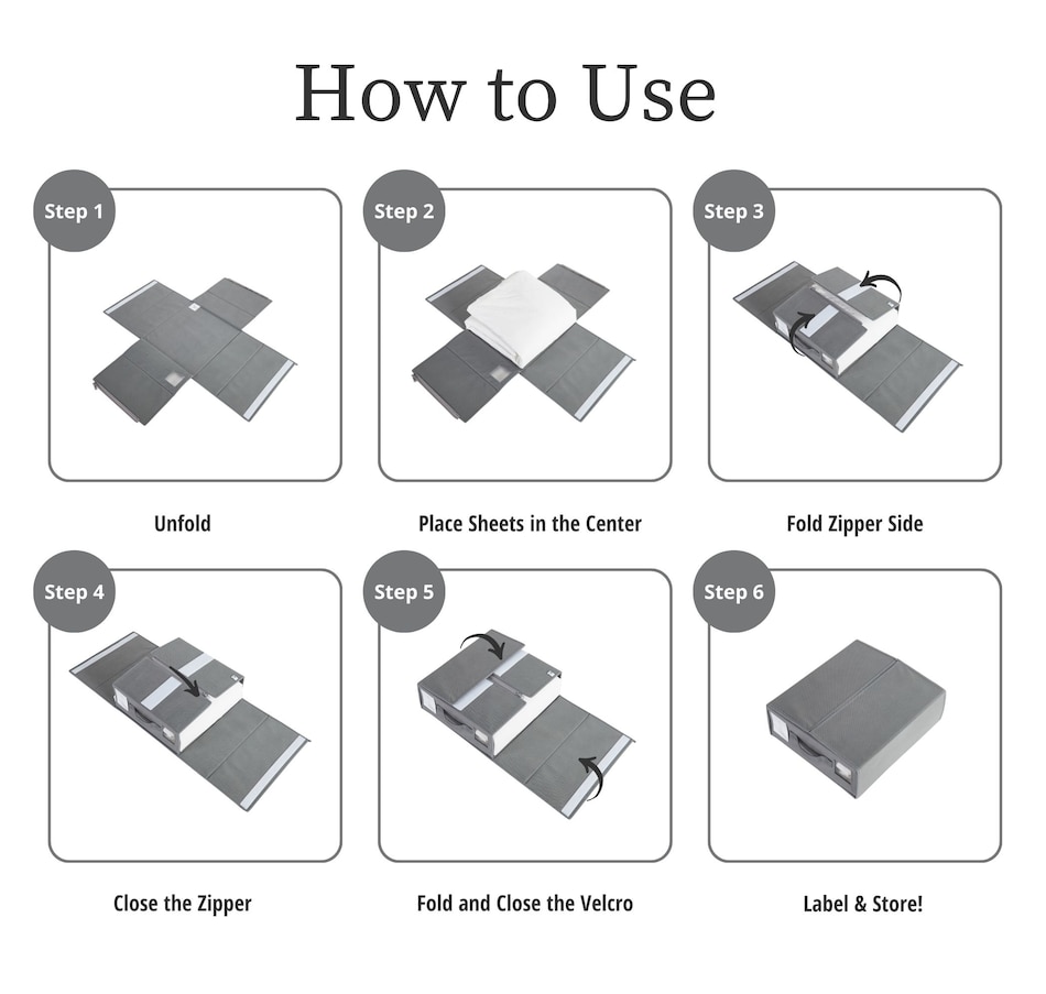 DECOMOMO offers a sheet organizer for linen closet to streamline bedroom storage. The sheet set organizer is designed for efficient bedding storage, keeping your bedroom clutter-free. It features label holders and a clear window for easy identification of stored sheets. The Velcro and zipper closures compress the sheets organizer for linen closet organizer, saving space and providing a secure seal against dust and pests. Each pack includes three sheet storage organizers with dimensions of 15” x 13” x 5”, suitable for queen/king sheet sets or duvet cover sets. Set of 4 Size: 15” (L) x 13” (W) x 5” (H) / 38cm (L) x 33cm (W) x 13cm (H) Model: 23110-4P