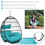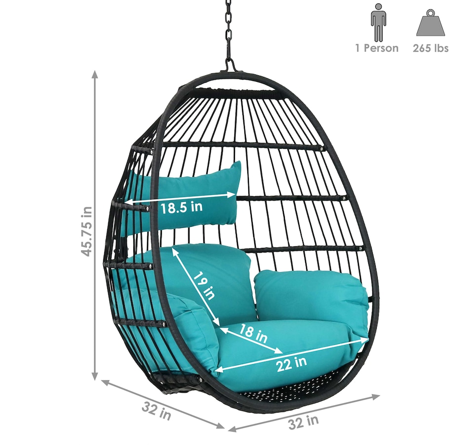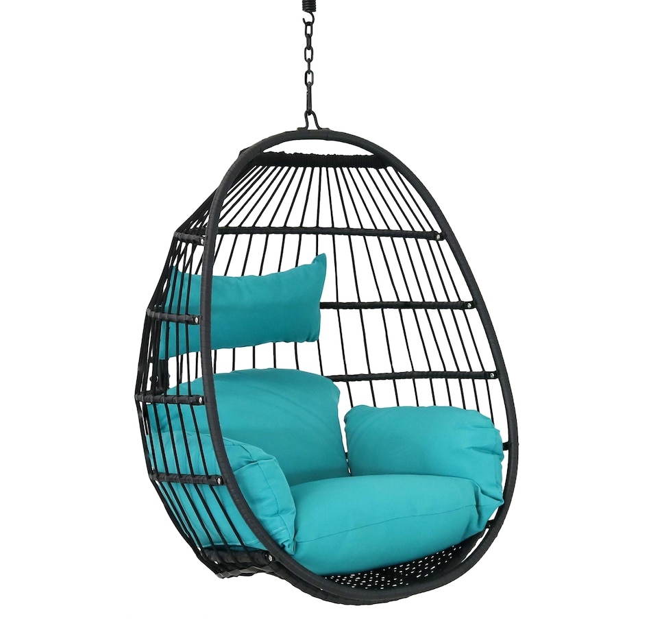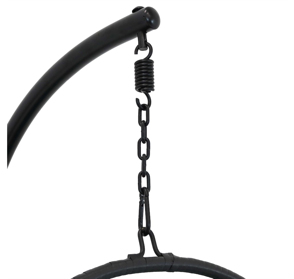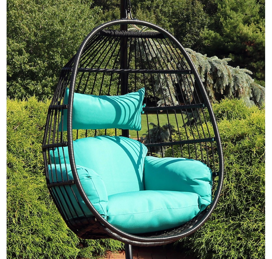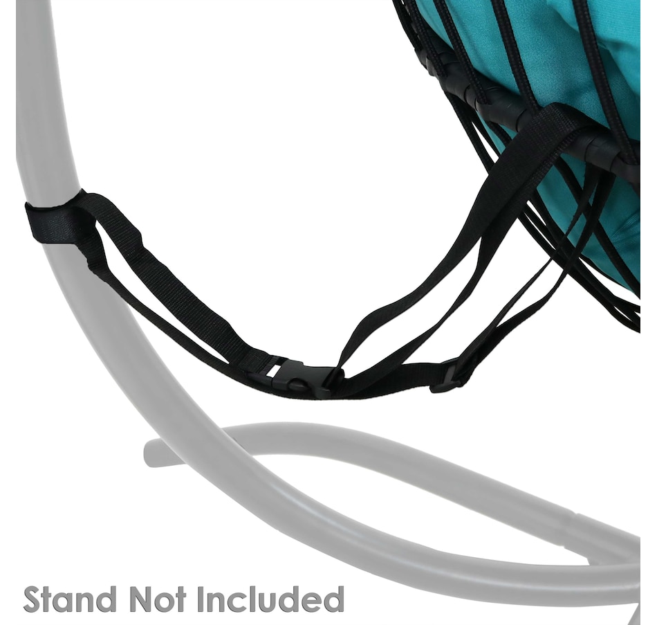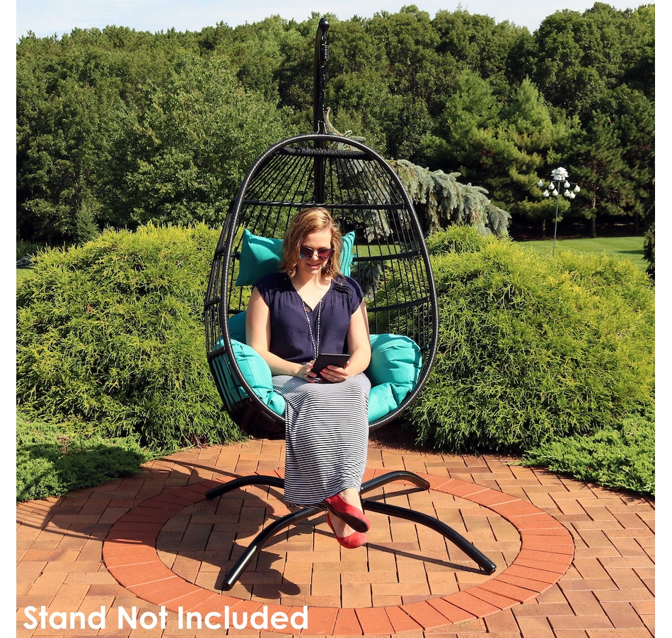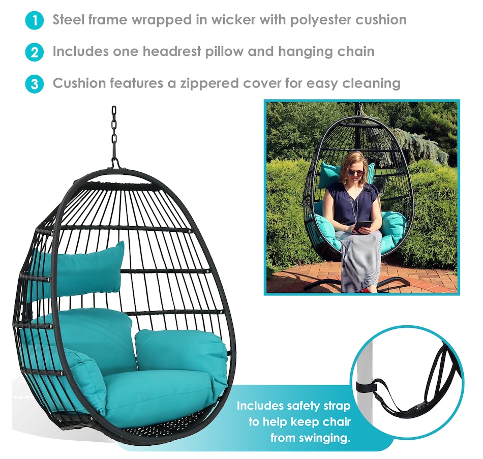 Relax on the patio or balcony in style while sitting on the Dalia hanging egg chair with cushions from Sunnydaze Decor. This chair features a durable construction with a steel frame wrapped in weather-resistant polyethylene rattan and a nylon rope chair back. This chair is strong and sturdy, but it is also built for comfort and relaxation with a comfy headrest and soft, all-in-one seat, back, and arm cushion. The headrest pillow is easily tied to the frame of the chair using the attached fabric ties, and the cushion features zippers to simply remove the inner cushion for easy cleaning. The rattan wicker construction is also smooth to the touch so you will not have to worry about splinters. A safety strap is included to connect the chair to a stand to help keep the chair safely in place while getting in and out of the chair (stand is not included).