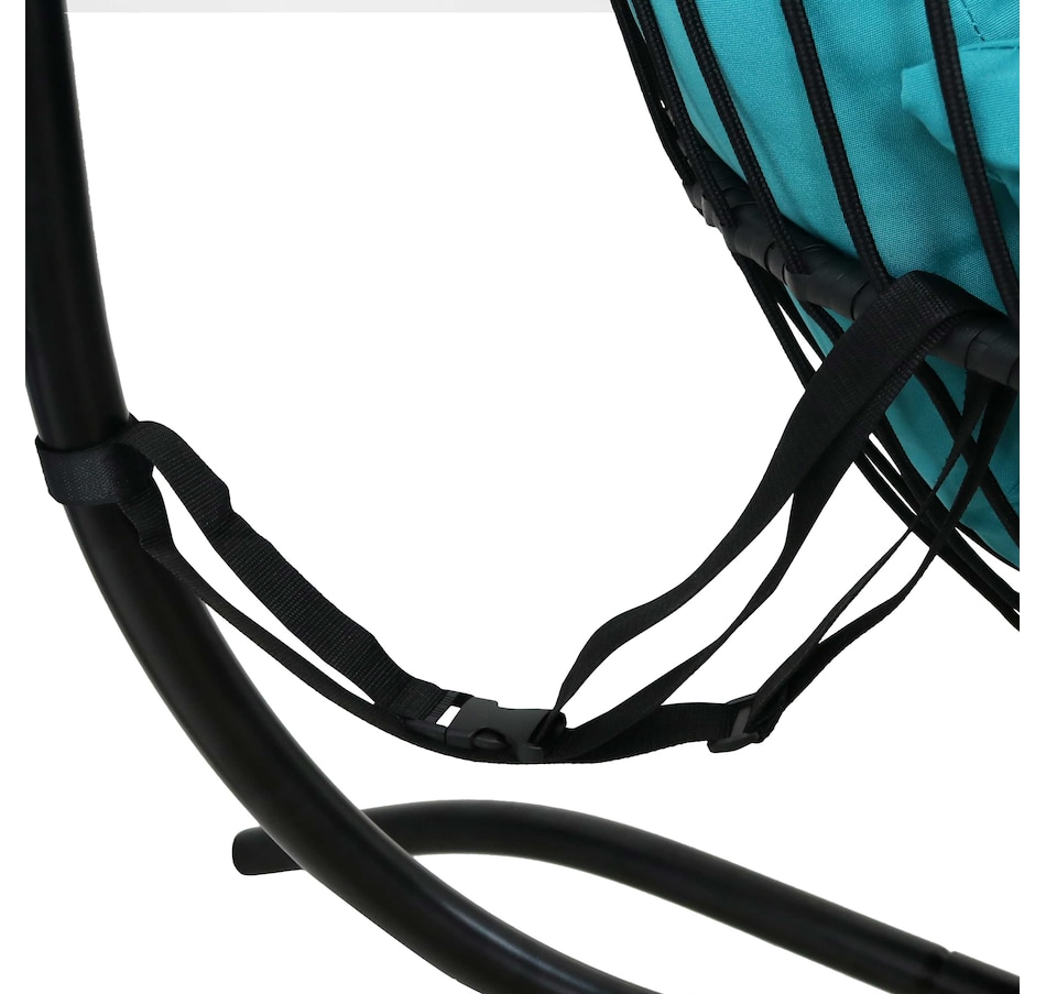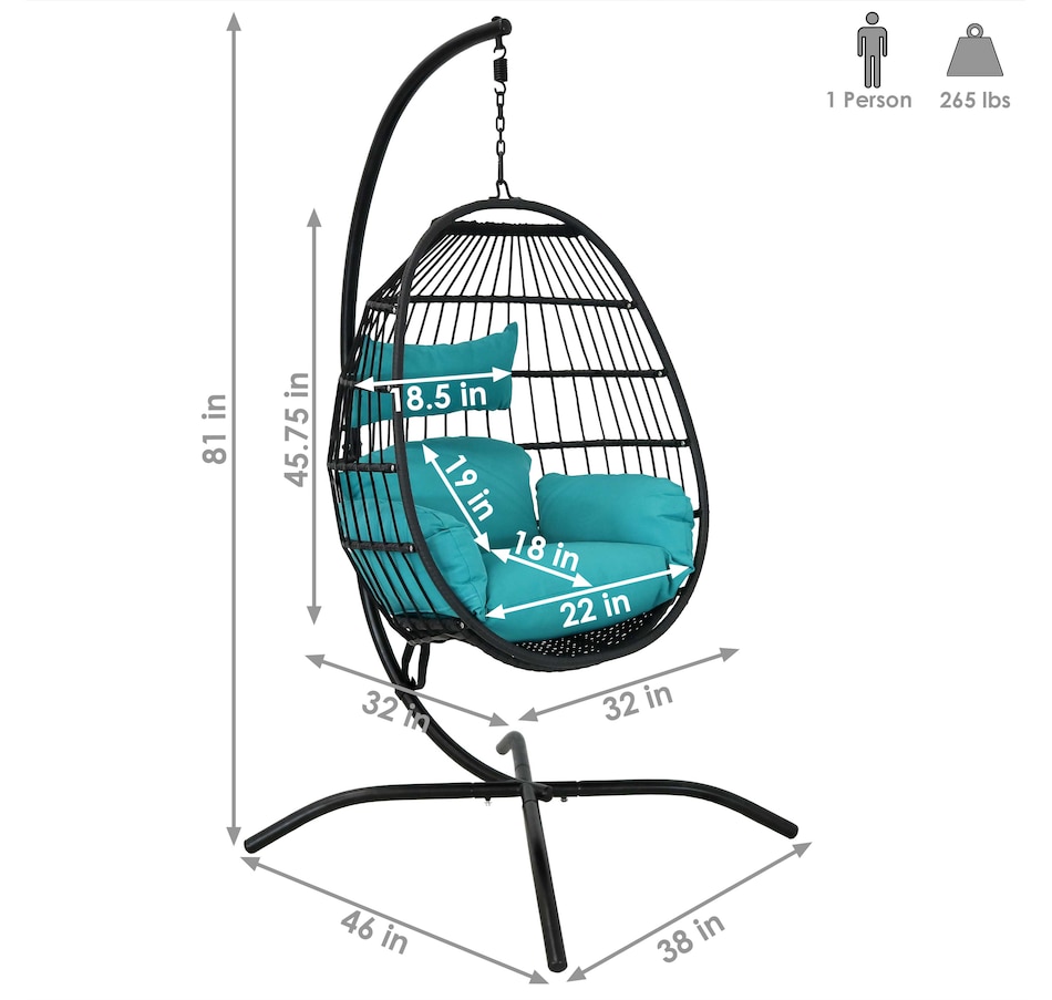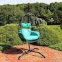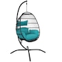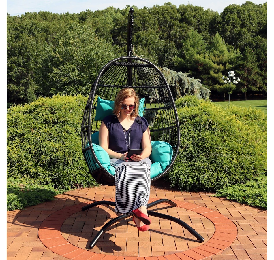Enjoy the backyard in comfort and style with this Dalia hanging egg chair featuring cushions and an included stand. This outdoor seating option is great for a variety of outdoor living spaces because it is durably constructed of polyethylene rattan wicker wrapped around a steel frame. The stand is also made of strong steel with an attractive, sleek, black, powder-coated finish for resistance to the elements outdoors and for long-lasting use. Sink into this chair on the plush and cozy seat cushion and lean back into the soft headrest. Everything needed to assemble this egg chair and stand is in the box to set it up and enjoy right away. Relax with feelings of floating on a cloud while reading, napping, basking in the sun, or resting with some snacks in the warm breeze outdoors. Also place this chair indoors for ultimate relaxation anywhere without having to drill holes in the ceiling.