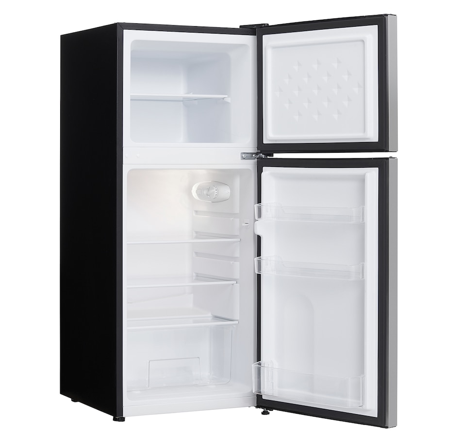 This 4.2-cubic-foot top-mount compact refrigerator by Danby is perfect for small apartments, rec rooms, home bars and cottages. This stainless steel dual-door fridge comes equipped with one full-width freezer section and a large fridge section with two full-width and one-and-a-half-width adjustable glass shelves. This mini fridge fits in almost any space with its reversible door hinge for right- or left-handed opening. The operation of this top-mount fridge is made simple with a mechanical thermostat and manual defrost, and you won't have to worry about storage space since this compact comes with one big vegetable crisper, integrated door shelves, and tall bottle storage. Lastly, this model is Energy-Star compliant and runs on environmentally friendly R600a refrigerant.
