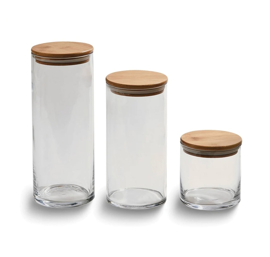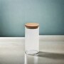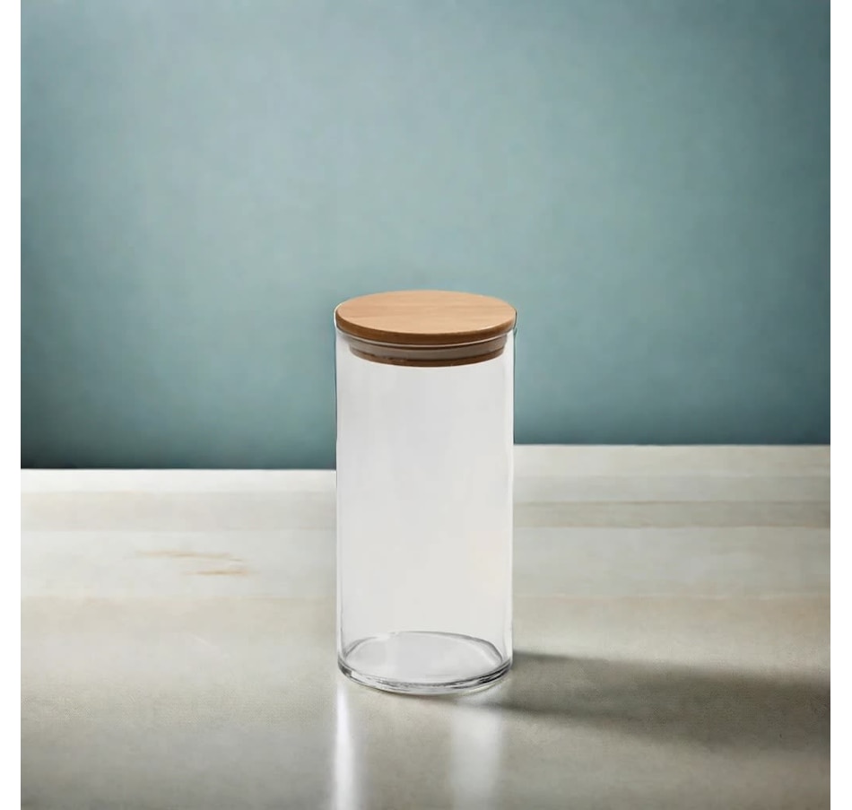 Looking for function and style in a storage container? You have found both with our glass jar with bamboo wood cover. The contemporary styled glass jar is 8.125" H and has a diameter of 4". The bamboo wood cover has a rubber gasket to help create a tight seal and can hold 40 liquid ounces. This item could have optional laser engraving done on either the glass jar or the bamboo wood cover. Gift Boxed