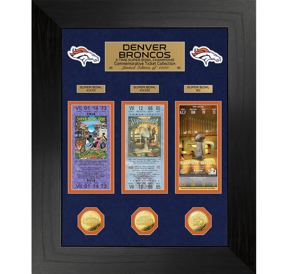 Limited Edition of only 1000, three tickets and three coins in an exquisite frame. The history of the Denver Broncos Super Bowl tickets and game coins from each of their three world titles are featured in this beautiful wood frame with 2.5" wide molding and protected under a plexi glass front panel. Laser cut navy suede matting with an orange mat prominently displays the three replica Super Bowl tickets and the three 39mm gold flashed “game or “Flip” coins as well as the engraved nameplates and die cut team logos. This is a true collectible considering the history of the Super bowl, the evolution of the tickets and the gold Super Bowl game coins. Each frame is accompanied by an individually numbered certificate of authenticity. Officially licensed by the NFL. Proudly made in the USA by The Highland Mint!